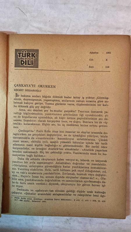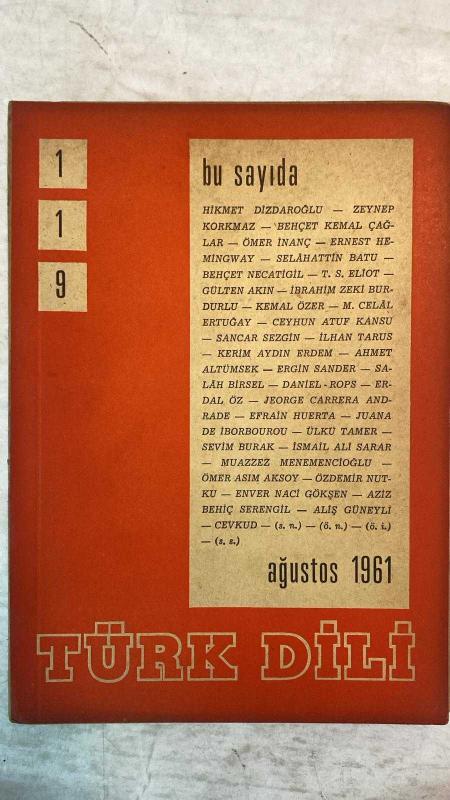 TÜRK DİLİ, AYLIK DİL VE YAZIN DERGİSİ - 1 AĞUSTOS 1961 SAYI: 119 HİKMET DİZDAROĞLU: ÇANKAYA'YI OKURKEN - ZEYNEP KORKMAZ: BİR FRANSIZCA KELİMENİN TÜRKÇE İLE İLGİSİ ÜZERİNE - BEHÇET KEMAL ÇAĞLAR: ERCİYAS'IN ETEĞİNDE - ÖMER İNANÇ: HEMINGWAY'E SELAM - ERNEST HEMINGWAY: ASKERİN EVİ - SELAHATTİN BATU: VATAN - BEHÇET NECATİGİL: GÖRÜCÜLER - T. S. ELIOT: HAMLET - GÜLTEN AKIN: SAVRULUP GİTTİĞİ - İBRAHİM ZEKİ BURDURLU: GRAMER ÖĞRETİMİNDE METOT - KEMAL ÖZER: IRMAK BOYLARINDA SÖYLENEN - M. CELAL ERTUĞAY: SEN BİLİYORSUN - CEYHUN ATUF KANSU: SELE GİTMİŞ KÜÇÜK KIZA AĞIT - SANCAR SEZGİN: DENEYLER - İLHAN TARUS: SÜZÜLMÜŞ GÜN IŞIĞI - KERİM AYDIN ERDEM: SEVMEK KAÇMAK DEĞİL - AHMET ALTÜMSEK: ANNELER - ERGİN SANDER: KARANFİL - SALAH BİRSEL: AKASYALAR AÇARKEN - ÜLKÜ TAMER: ÜÇ ORTA-AMERİKA ŞİİRİ - ERDAL ÖZ: YALNIZ'IN GÜNLÜĞÜ'NDEN - DANIEL ROPS: SÖZLÜKLERE ÖVGÜ - SEVİM BURAK: SEDEF KAKMALI EV - MUAZZEZ MENEMENCİOĞLU: DERİNLERDEKİ KORKU - İSMAİL ALİ SARAR: GELİBOLU - ÖMER ASIM AKSOY: DÜŞÜNCELER, DÜZ- 60 SAYFA, ŞERAFETTİN TURAN tarafından kaleme alınmıştır. Eser CAHİT KÜLEBİ editörlüğünde hazırlanmıştır. TÜRK DİLİ, AYLIK DİL VE YAZIN DERGİSİ - 1 AĞUSTOS 1961 SAYI: 119 HİKMET DİZDAROĞLU: ÇANKAYA'YI OKURKEN - ZEYNEP KORKMAZ: BİR FRANSIZCA KELİMENİN TÜRKÇE İLE İLGİSİ ÜZERİNE - BEHÇET KEMAL ÇAĞLAR: ERCİYAS'IN ETEĞİNDE - ÖMER İNANÇ: HEMINGWAY'E SELAM - ERNEST HEMINGWAY: ASKERİN EVİ - SELAHATTİN BATU: VATAN - BEHÇET NECATİGİL: GÖRÜCÜLER - T. S. ELIOT: HAMLET - GÜLTEN AKIN: SAVRULUP GİTTİĞİ - İBRAHİM ZEKİ BURDURLU: GRAMER ÖĞRETİMİNDE METOT - KEMAL ÖZER: IRMAK BOYLARINDA SÖYLENEN - M. CELAL ERTUĞAY: SEN BİLİYORSUN - CEYHUN ATUF KANSU: SELE GİTMİŞ KÜÇÜK KIZA AĞIT - SANCAR SEZGİN: DENEYLER - İLHAN TARUS: SÜZÜLMÜŞ GÜN IŞIĞI - KERİM AYDIN ERDEM: SEVMEK KAÇMAK DEĞİL - AHMET ALTÜMSEK: ANNELER - ERGİN SANDER: KARANFİL - SALAH BİRSEL: AKASYALAR AÇARKEN - ÜLKÜ TAMER: ÜÇ ORTA-AMERİKA ŞİİRİ - ERDAL ÖZ: YALNIZ'IN GÜNLÜĞÜ'NDEN - DANIEL ROPS: SÖZLÜKLERE ÖVGÜ - SEVİM BURAK: SEDEF KAKMALI EV - MUAZZEZ MENEMENCİOĞLU: DERİNLERDEKİ KORKU - İSMAİL ALİ SARAR: GELİBOLU - ÖMER ASIM AKSOY: DÜŞÜNCELER, DÜZ- 60 SAYFA adlı eser Türkçe dilindedir.