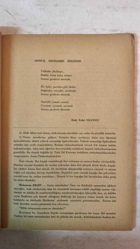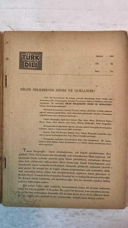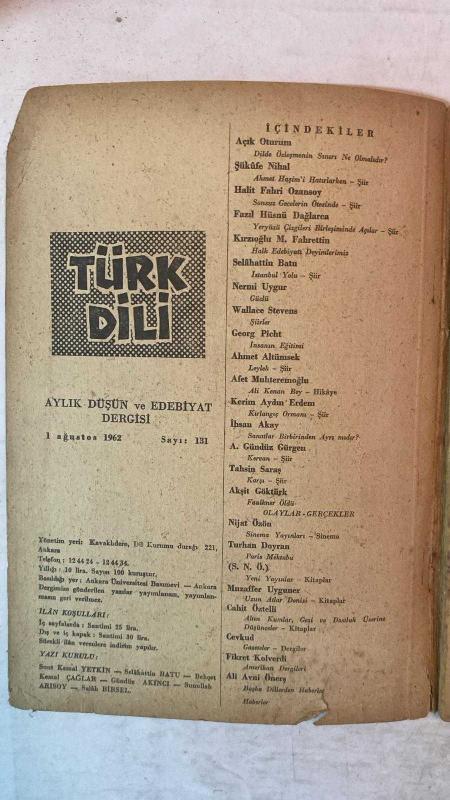 TÜRK DİLİ, AYLIK DİL VE YAZIN DERGİSİ - 1 AĞUSTOS 1962 SAYI:131 AÇIK OTURUM: DİLDE ÖZLEŞMENİN SINIRI NE OLMALIDIR? - ŞÜKÜFE NİHAL: AHMET HAŞİM’İ HATIRLARKEN ŞİİR - HALİT FAHRİ OZANSOY: SONSUZ GECELERİN ÖTESİNDE ŞİİR - FAZIL HÜSNÜ DAĞLARCA: YERYÜZÜ ÇİZGİLERİ BİRLEŞİMİNDE AÇILAR ŞİİR - M. FAHRETTİN KIRZIOĞLU: HALK EDEBİYATI DEYİMLERİMİZ - SELAHATTİN BATU: İSTANBUL YOLU - NERMİ UYGUR: GÜÇLÜ - WALLACE STEVENS: ŞİİRLER - GEORG PICHT: İNSANIN EĞİTİMİ - AHMET ALTÜMSEK: LEYLEK ŞİİR - AFET MUHTEREMOĞLU: ALİ KENAN BEY HİKÂYE - KERİM AYDIN ERDEM: KIRLANGIÇ ORMANI ŞİİR - İHSAN AKAY: SANATLAR BİRBİRİNDEN AYRI MIDIR? - A. GÜNDÜZ GÜRGEN: KERVAN ŞİİR - TAHSİN SARAÇ: KARŞI ŞİİR - AKŞİT GÖKTÜRK: FAULKNER ÖLDÜ - NİJAT ÖZÖN: SİNEMA YAYINLARI SİNEMA - TURHAN DOYRAN: PARİS MEKTUBU - YENİ YAYINLAR KİTAPLAR - MUZAFFER UYGUNER: UZUN ATLAR DENİZİ KİTAPLAR - CAHİT ÖZTELLİ: ALTIN KUMLAR GEZİ VE DOSTLUK ÜZERİNE DÜŞÜNCELER KİTAPLAR - CEVKUD: GAZETELER DERGİLER - FİKRET KOLVERDİ - ALİ AVNİ ÖNEŞ: AMERİKAN - 64 SAYFA, ŞERAFETTİN TURAN tarafından kaleme alınmıştır. Eser CAHİT KÜLEBİ editörlüğünde hazırlanmıştır. TÜRK DİLİ, AYLIK DİL VE YAZIN DERGİSİ - 1 AĞUSTOS 1962 SAYI:131 AÇIK OTURUM: DİLDE ÖZLEŞMENİN SINIRI NE OLMALIDIR? - ŞÜKÜFE NİHAL: AHMET HAŞİM’İ HATIRLARKEN ŞİİR - HALİT FAHRİ OZANSOY: SONSUZ GECELERİN ÖTESİNDE ŞİİR - FAZIL HÜSNÜ DAĞLARCA: YERYÜZÜ ÇİZGİLERİ BİRLEŞİMİNDE AÇILAR ŞİİR - M. FAHRETTİN KIRZIOĞLU: HALK EDEBİYATI DEYİMLERİMİZ - SELAHATTİN BATU: İSTANBUL YOLU - NERMİ UYGUR: GÜÇLÜ - WALLACE STEVENS: ŞİİRLER - GEORG PICHT: İNSANIN EĞİTİMİ - AHMET ALTÜMSEK: LEYLEK ŞİİR - AFET MUHTEREMOĞLU: ALİ KENAN BEY HİKÂYE - KERİM AYDIN ERDEM: KIRLANGIÇ ORMANI ŞİİR - İHSAN AKAY: SANATLAR BİRBİRİNDEN AYRI MIDIR? - A. GÜNDÜZ GÜRGEN: KERVAN ŞİİR - TAHSİN SARAÇ: KARŞI ŞİİR - AKŞİT GÖKTÜRK: FAULKNER ÖLDÜ - NİJAT ÖZÖN: SİNEMA YAYINLARI SİNEMA - TURHAN DOYRAN: PARİS MEKTUBU - YENİ YAYINLAR KİTAPLAR - MUZAFFER UYGUNER: UZUN ATLAR DENİZİ KİTAPLAR - CAHİT ÖZTELLİ: ALTIN KUMLAR GEZİ VE DOSTLUK ÜZERİNE DÜŞÜNCELER KİTAPLAR - CEVKUD: GAZETELER DERGİLER - FİKRET KOLVERDİ - ALİ AVNİ ÖNEŞ: AMERİKAN - 64 SAYFA adlı eser Türkçe dilindedir.