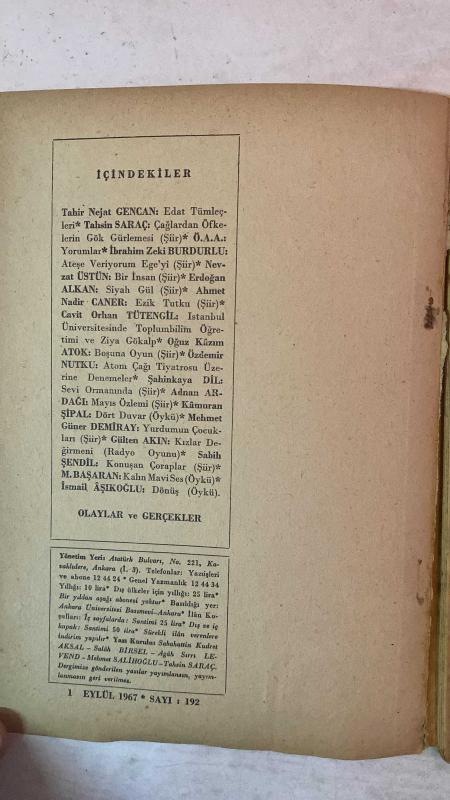 TÜRK DİLİ, AYLIK DİL VE YAZIN DERGİSİ - 1 EYLÜL 1967 SAYI: 192 TAHİR NEJAT GENCAN: EDAT TÜMLEÇLERİ - TAHSİN SARAÇ: ÇAĞLARDAN ÖFKELERİN GÖK GÜRLEMESİ - Ö.A.A: YORUMLAR - İBRAHİM ZEKİ BURDURLU: ATEŞE VERİYORUM EGE’Yİ - NEVZAT ÜSTÜN: BİR İNSAN - ERDOĞAN ALKAN: SİYAH GÜL - AHMET NADİR CANER: EZİK TUTKU - CAVİT ORHAN TÜTENGİL: İSTANBUL ÜNİVERSİTESİNDE TOPLUMBİLİM ÖĞRETİMİ VE ZİYA GÖKALP - OĞUZ KÂZIM ATOK: BOŞUNA OYUN - ÖZDEMİR NUTKU: ATOM ÇAĞI TİYATROSU ÜZERİNE DENEMELER - ŞAHİNKAYA DİL: SEVİ ORMANINDA - ADNAN ARDAĞI: MAYIS ÖZLEMİ - KÂMURAN ŞİPAL: DÖRT DUVAR - MEHMET GÜNER DEMİRAY: YURDUMUN ÇOCUKLARI - GÜLTEN AKIN: KIZLAR DEĞİRMENİ (RADYO OYUNU) - SABİH ŞENDİL: KONUŞAN ÇORAPLAR - M. BAŞARAN: KALIN MAVİ SES - İSMAİL ÂŞIKOĞLU: DÖNÜŞ OLAYLAR VE GERÇEKLER- 80 SAYFA adlı eser, Kitap > Süreli Yayınlar > Dergiler > Siyaset kategorisinde İkinci El olarak satıştadır.