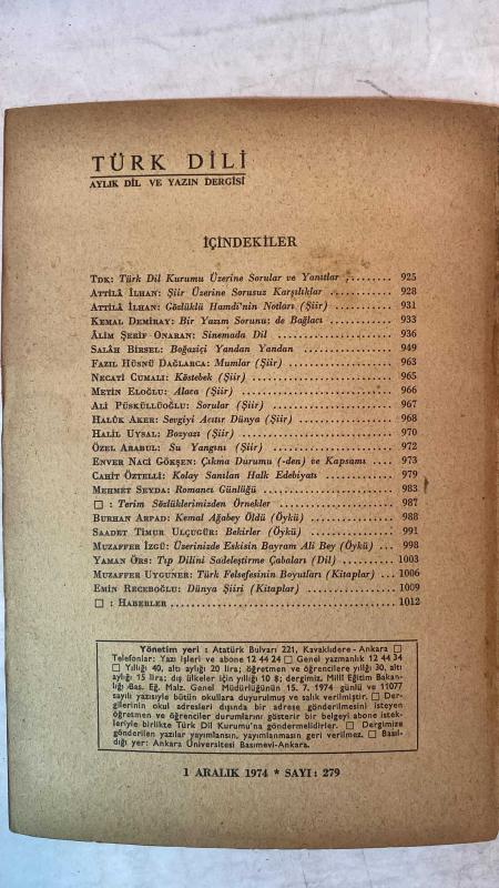 TÜRK DİLİ, AYLIK DİL VE YAZIN DERGİSİ - ARALIK 1974 SAYI: 279 TDK: TÜRK DİL KURUMU ÜZERİNE SORULAR VE YANITLAR - ATTİLA İLHAN: ŞİİR ÜZERİNE SORUSUZ KARŞILIKLAR - ATTİLA İLHAN: GÖZLÜKLÜ HAMDİ'NİN NOTLARI - KEMAL DEMİRAY: BİR YAZIM SORUNU: DE BAĞLACI - ALİM ŞERİF ONARAN: SİNEMADA DİL - SALAH BİRSEL: BOĞAZİÇİ YANDAN YANDAN - FAZIL HÜSNÜ DAĞLARCA: MUMLAR - NECATİ CUMALI: KÖSTEBEK - METİN ELOĞLU: ALACA - ALİ PÜSKÜLLÜOĞLU: SORULAR - HALUK AKER: SEVGİYİ AÇITIR DÜNYA - HALİL UYSAL: BOZYAZI - ÖZEL ARABUL: SU YANGINI - ENVER NACİ GÖKŞEN: ÇIKMA DURUMU (-DEN) VE KAPSAMI - CAHİT ÖZTELLI: KOLAY SANILAN HALK EDEBİYATI - MEHMET SEYDA: ROMANCI GÜNLÜĞÜ - TERİM SÖZLÜKLERİMİZDEN ÖRNEKLER - BURHAN ARPAD: KEMAL AĞABEY ÖLDÜ - SAADET TIMUR ULÇUGÜR: BEKİRLER - MUZAFFER IZCÜ: ÜZERİNİZDE ESKİSİN BAYRAM ALİ BEY - YAMAN ÖRS: TİP DİLİNİ SADELEŞTİRME ÇABALARI - MUZAFFER UYGUNER: TÜRK FELSEFESİNİN BOYUTLARI - EMİN RECEBOĞLU: DÜNYA ŞİİRİ - 60 SAYFA, ŞERAFETTİN TURAN tarafından kaleme alınmıştır. Eser CAHİT KÜLEBİ editörlüğünde hazırlanmıştır. TÜRK DİLİ, AYLIK DİL VE YAZIN DERGİSİ - ARALIK 1974 SAYI: 279 TDK: TÜRK DİL KURUMU ÜZERİNE SORULAR VE YANITLAR - ATTİLA İLHAN: ŞİİR ÜZERİNE SORUSUZ KARŞILIKLAR - ATTİLA İLHAN: GÖZLÜKLÜ HAMDİ'NİN NOTLARI - KEMAL DEMİRAY: BİR YAZIM SORUNU: DE BAĞLACI - ALİM ŞERİF ONARAN: SİNEMADA DİL - SALAH BİRSEL: BOĞAZİÇİ YANDAN YANDAN - FAZIL HÜSNÜ DAĞLARCA: MUMLAR - NECATİ CUMALI: KÖSTEBEK - METİN ELOĞLU: ALACA - ALİ PÜSKÜLLÜOĞLU: SORULAR - HALUK AKER: SEVGİYİ AÇITIR DÜNYA - HALİL UYSAL: BOZYAZI - ÖZEL ARABUL: SU YANGINI - ENVER NACİ GÖKŞEN: ÇIKMA DURUMU (-DEN) VE KAPSAMI - CAHİT ÖZTELLI: KOLAY SANILAN HALK EDEBİYATI - MEHMET SEYDA: ROMANCI GÜNLÜĞÜ - TERİM SÖZLÜKLERİMİZDEN ÖRNEKLER - BURHAN ARPAD: KEMAL AĞABEY ÖLDÜ - SAADET TIMUR ULÇUGÜR: BEKİRLER - MUZAFFER IZCÜ: ÜZERİNİZDE ESKİSİN BAYRAM ALİ BEY - YAMAN ÖRS: TİP DİLİNİ SADELEŞTİRME ÇABALARI - MUZAFFER UYGUNER: TÜRK FELSEFESİNİN BOYUTLARI - EMİN RECEBOĞLU: DÜNYA ŞİİRİ - 60 SAYFA adlı eser Türkçe dilindedir.