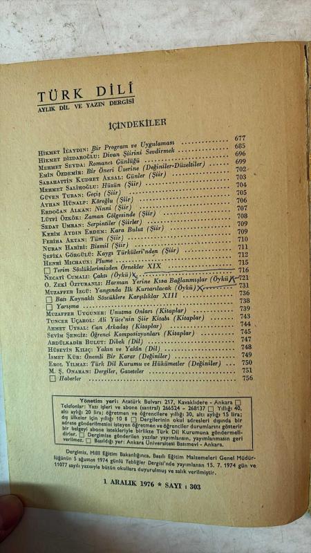 TÜRK DİLİ, AYLIK DİL VE YAZIN DERGİSİ - ARALIK 1976 SAYI: 303 - ERDOĞAN ALKAN: NİNİ - LÜTFİ ÖZKÖK: ZAMAN GÖLGESİNDE - SEDAT UMRAN: SERPİNTİLER - HİKMET İLAYDIN: BİR PROGRAM VE UYGULAMASI - HİKMET DİZDAROĞLU: DİVAN ŞİİRİNİ SEVDİRMEK - MEHMET SEYDA: ROMANCI GÜNLÜĞÜ - EMİN ÖZDEMİR: BİR ÖNERİ ÜZERİNE (DEĞİNİLER-DÜZELTİLER) - SABAHATTİN KUDRET AKSAL: GÜNLER - MEHMET SALIHOĞLU: HÜZÜN - GÜVEN TURAN: GEÇİŞ - AYHAN HÜNALP: KÖROĞLU - KERİM AYDIN ERDEM: KARA BULUT - FERİHA AKTAN: TÜM - NURAN HARIRI: BİSMİL - ŞEFİKA GÖRGÜLÜ: KAYGI TÜRKÜLERİ'NDEN - HENRI MICHAUX: PLUME - NECATİ CUMALI: ÇAKTI - MUZAFFER İZCÜ: YANGINDA İLK KURTARILACAK - O. ZEKİ ÖZTURANLI: HARMAN YERİNE KISA BAĞLANMIŞLAR - MUZAFFER UYGUNER: UNUTMA ONLARI - TUNCER UÇAROL: ALİ YÜCE'NİN ŞİİR KİTABI - AHMET UYSAL: CAN ARKADAŞ - SEVİM ŞENGİZ: ÖĞRENCİ KOMPOSİZYONLARI - ABDÜLKADİR BULUT: DİBEK - HÜSEYİN KILIÇ: YAKIN VE YAKİN - İSMET KÜR: ÖNEMLİ BİR KARAR - EROL YILMAZ: TÜRK DİL KURUMU VE HÜKÜMETLER - M. S. ONA - TAM TAKIM EKSİKSİZ 80 SAYFA, ŞERAFETTİN TURAN tarafından kaleme alınmıştır. Eser CAHİT KÜLEBİ editörlüğünde hazırlanmıştır. TÜRK DİLİ, AYLIK DİL VE YAZIN DERGİSİ - ARALIK 1976 SAYI: 303 - ERDOĞAN ALKAN: NİNİ - LÜTFİ ÖZKÖK: ZAMAN GÖLGESİNDE - SEDAT UMRAN: SERPİNTİLER - HİKMET İLAYDIN: BİR PROGRAM VE UYGULAMASI - HİKMET DİZDAROĞLU: DİVAN ŞİİRİNİ SEVDİRMEK - MEHMET SEYDA: ROMANCI GÜNLÜĞÜ - EMİN ÖZDEMİR: BİR ÖNERİ ÜZERİNE (DEĞİNİLER-DÜZELTİLER) - SABAHATTİN KUDRET AKSAL: GÜNLER - MEHMET SALIHOĞLU: HÜZÜN - GÜVEN TURAN: GEÇİŞ - AYHAN HÜNALP: KÖROĞLU - KERİM AYDIN ERDEM: KARA BULUT - FERİHA AKTAN: TÜM - NURAN HARIRI: BİSMİL - ŞEFİKA GÖRGÜLÜ: KAYGI TÜRKÜLERİ'NDEN - HENRI MICHAUX: PLUME - NECATİ CUMALI: ÇAKTI - MUZAFFER İZCÜ: YANGINDA İLK KURTARILACAK - O. ZEKİ ÖZTURANLI: HARMAN YERİNE KISA BAĞLANMIŞLAR - MUZAFFER UYGUNER: UNUTMA ONLARI - TUNCER UÇAROL: ALİ YÜCE'NİN ŞİİR KİTABI - AHMET UYSAL: CAN ARKADAŞ - SEVİM ŞENGİZ: ÖĞRENCİ KOMPOSİZYONLARI - ABDÜLKADİR BULUT: DİBEK - HÜSEYİN KILIÇ: YAKIN VE YAKİN - İSMET KÜR: ÖNEMLİ BİR KARAR - EROL YILMAZ: TÜRK DİL KURUMU VE HÜKÜMETLER - M. S. ONA - TAM TAKIM EKSİKSİZ 80 SAYFA adlı eser Türkçe dilindedir.