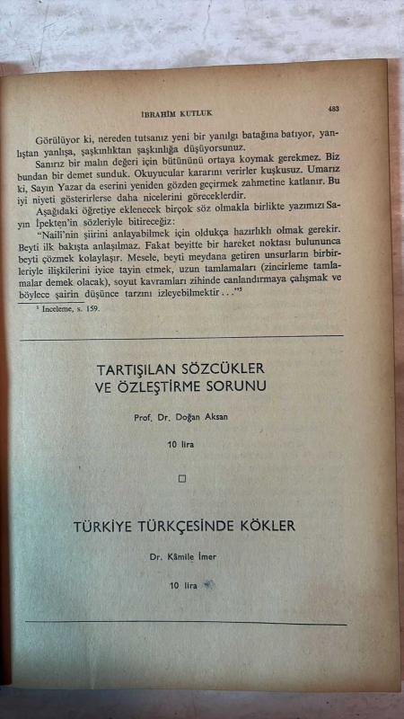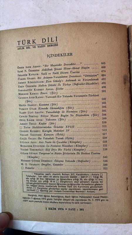 TÜRK DİLİ, AYLIK DİL VE YAZIN DERGİSİ - EKİM 1976 SAYI: 301 - ÖMER ASIM AKSOY: "BİR MEŞALEDİR DEVREDİLİR..." - SAMİ N. ÖZERDİM: ABDÜLHAK ŞİNASİ HİSAR - AHMET HAŞİM - İBRAHİM KUTLUK: NAİLİ VE NAİLİ DİVANI ÜZERİNE - ÜLKER ONART: BİR ANLAMA-YORUMLAMA DENEMESİ: "DÖNÜŞÜM" - AHMET KÖKLİGİLLER: ZİYA GÖKALP'İ ANLAMAK VE YORUMLAMAK - EMİN ÖZDEMİR: HALKIN DİLİDİR ÖZ TÜRKÇE (DEĞİNİLER-DÜZELTİLER) - SABAHATTİN KUDRET AKSAL: ŞİİRLER - MEHMED KEMAL: ZİNCİR - CEYHUN ATUF KANSU: YUMUŞAK KIR YOLUNDA YÜRÜMENİN TÜRKÜSÜ - METİN ELOĞLU: KANAMA - TURGUT UYAR: KİMSEDE GÖRMEDİĞİM - NAHİT ULVİ AKGÜN: YUNUSBALIĞI İLE HERMİYES - CENGİZ BEKTAŞ: BİLİYOR MUSUN BUGÜN NE DÜŞÜNDÜM - OĞUZ KAZIM ATOK: YAKINMA - AHMET TELLI: KUŞLAR - CEVDET KUDRET: KARAGÖZ METİNLERİ IV - NECATİ TOSUNER: KAMYON - CELAL ÖZCAN: ÖTE YAKADAKİ TUTSAK - GÜLTEN AKIN: AZİZ NESİN İLE ÇOCUKLAR - MUZAFFER UYGUNER: LA FONTAINE MASALLARI - VECİHİ TIMUROĞLU: ELİF DİYE BİR TÜRKÜ - GÜLER GÜVEN: TANPINAR'IN BÜTÜN ŞİİRLERİNİN - TAM TAKIM EKSİKSİZ 86 SAYFA, ŞERAFETTİN TURAN tarafından kaleme alınmıştır. Eser CAHİT KÜLEBİ editörlüğünde hazırlanmıştır. TÜRK DİLİ, AYLIK DİL VE YAZIN DERGİSİ - EKİM 1976 SAYI: 301 - ÖMER ASIM AKSOY: "BİR MEŞALEDİR DEVREDİLİR..." - SAMİ N. ÖZERDİM: ABDÜLHAK ŞİNASİ HİSAR - AHMET HAŞİM - İBRAHİM KUTLUK: NAİLİ VE NAİLİ DİVANI ÜZERİNE - ÜLKER ONART: BİR ANLAMA-YORUMLAMA DENEMESİ: "DÖNÜŞÜM" - AHMET KÖKLİGİLLER: ZİYA GÖKALP'İ ANLAMAK VE YORUMLAMAK - EMİN ÖZDEMİR: HALKIN DİLİDİR ÖZ TÜRKÇE (DEĞİNİLER-DÜZELTİLER) - SABAHATTİN KUDRET AKSAL: ŞİİRLER - MEHMED KEMAL: ZİNCİR - CEYHUN ATUF KANSU: YUMUŞAK KIR YOLUNDA YÜRÜMENİN TÜRKÜSÜ - METİN ELOĞLU: KANAMA - TURGUT UYAR: KİMSEDE GÖRMEDİĞİM - NAHİT ULVİ AKGÜN: YUNUSBALIĞI İLE HERMİYES - CENGİZ BEKTAŞ: BİLİYOR MUSUN BUGÜN NE DÜŞÜNDÜM - OĞUZ KAZIM ATOK: YAKINMA - AHMET TELLI: KUŞLAR - CEVDET KUDRET: KARAGÖZ METİNLERİ IV - NECATİ TOSUNER: KAMYON - CELAL ÖZCAN: ÖTE YAKADAKİ TUTSAK - GÜLTEN AKIN: AZİZ NESİN İLE ÇOCUKLAR - MUZAFFER UYGUNER: LA FONTAINE MASALLARI - VECİHİ TIMUROĞLU: ELİF DİYE BİR TÜRKÜ - GÜLER GÜVEN: TANPINAR'IN BÜTÜN ŞİİRLERİNİN - TAM TAKIM EKSİKSİZ 86 SAYFA adlı eser Türkçe dilindedir.