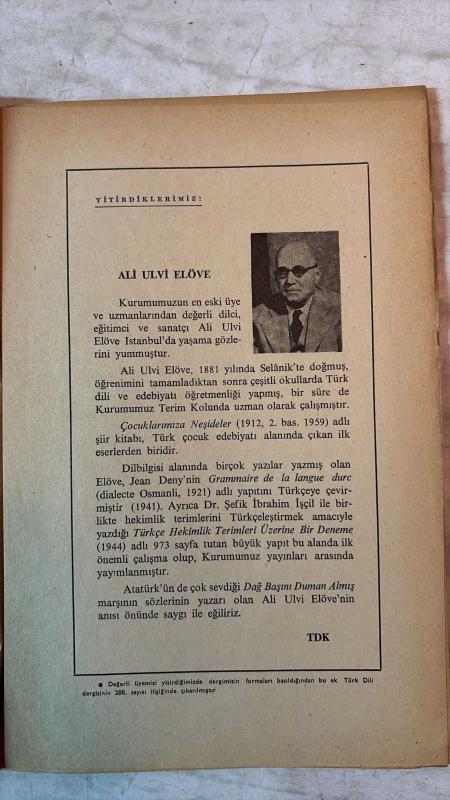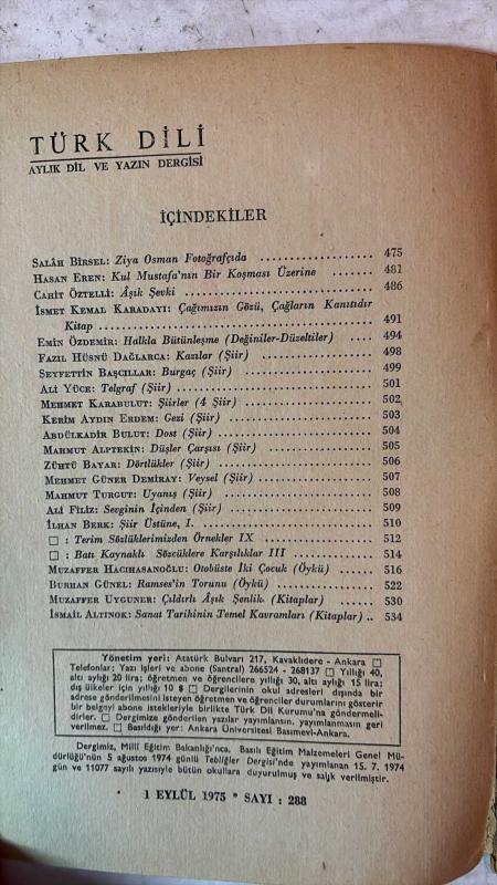 TÜRK DİLİ, AYLIK DİL VE YAZIN DERGİSİ - EYLÜL 1975 SAYI: 288 - SALAH BIRSEL: ZİYA OSMAN FOTOĞRAFÇIDA - HASAN EREN: KUL MUSTAFA'NIN BİR KOŞMASI ÜZERİNE - CAHİT ÖZTELLI: AŞIK ŞEVKİ - İSMET KEMAL KARADAYI: ÇAĞIMIZIN GÖZÜ, ÇAĞLARIN KANITIDIR - EMİN ÖZDEMİR: HALKLA BÜTÜNLEŞME (DEĞİNİLER-DÜZELTİLER) - FAZIL HÜSNÜ DAĞLARCA: KAZILAR - SEYFETTİN BAŞCILLAR: BURGAÇ - ALİ YÜCE: TELGRAF - MEHMET KARABULUT: ŞİİRLER (4 ŞİİR) - KERİM AYDIN ERDEM: GEZİ - ABDÜLKADİR BULUT: DOST - MAHMUT ALPTEKİN: DÜŞLER ÇARŞISI - ZÜHTÜ BAYAR: DÖRTLÜKLER - MEHMET GÜNER DEMİRAY: VEYSEL - MAHMUT TURGUT: UYANIŞ - ALİ FİLİZ: SEVGİNİN İÇİNDEN - İLHAN BERK: ŞİİR ÜSTÜNE I - TERİM SÖZLÜKLERİMİZDEN ÖRNEKLER IX - BATI KAYNAKLI SÖZCÜKLERE KARŞILIKLAR III - MUZAFFER HACIHASANOĞLU: OTOBÜSTE İKİ ÇOCUK - BURHAN GÜNEL: RAMSES'İN TORUNU - MUZAFFER UYGUNER: ÇILDIRLI AŞIK ŞENLİK - İSMAİL ALTINOK: SANAT TARİHİNİN TEMEL KAVRAMLARI- TAM TAKIM EKSİKSİZ 80 SAYFA adlı eser, Kitap > Süreli Yayınlar > Dergiler > Siyaset kategorisinde İkinci El olarak satıştadır.