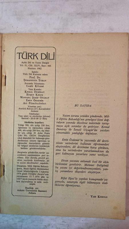 TÜRK DİLİ, AYLIK DİL VE YAZIN DERGİSİ - HAZİRAN 1982 SAYI: 3661 EMİN ÖZDEMİR - METİN ELOĞLU - ALİ PÜSKÜLLÜOĞLU - TARIK DURSUN K. - HASAN ŞİMŞEK - MEHMET DELİGÖNÜL - MEHMET SALİHOĞLU - İLHAN BERK - METİN ALTIOK - TUNCER UÇAROL - AHMET TELLİ - BEHÇET AYSAN - KEMAL DEMİRAY - ERDOĞAN ALKAN - HÜROL TAŞDELEN - İSMAİL ULÇUGÜR - AYDIN YALKUT - İBRAHİM YILDIZ - ÖMER ASIM AKSOY - M. Ş. ONARAN - ORHAN URAL - TALİP APAYDIN - NAİM TİRALİ - AYTEN UYAN - SEVDA ŞENER - GÜLŞEN KARAKADIOĞLU - ÂLİM ŞERİF ONARAN - HALDUN ARMAĞAN - RAMİS DARA BİR TÜRKÇE ÖĞRETMENİNE MEKTUP - BİLEYTAŞI - TARİH, COĞRAFYA, YURT BİLGİSİ - "DOST DOST DİYE DİYE..." - HER YER AKŞAM - DİVAN ŞİİRİ GÜNDEMDE - GÜLE KARŞI - EL YAZILARINA VURUYOR GÜNEŞ, IV - YAZDAN ÖNCE VE SONRA - ŞİİRLER ÜSTÜNE GÜNLÜK - ISLIK - YAKILMIŞ ŞİİRLER'DEN - ŞİKÂYET Mİ, ŞİKAYET Mİ? - OYUN - BİR VİŞNE DALINDA - BOŞUNA ÇABALAR - ANAMIN GÖZLERİ - SEVİ GÜLLERİ - DERSİMİZ TÜRKÇE - RİFAT ILGAZ'LA - ANILARDA NECATİGİL - "HAVAN KİME GÜ - TAM TAKIM EKSİKSİZ 62 SAYFA, ŞERAFETTİN TURAN tarafından kaleme alınmıştır. Eser CAHİT KÜLEBİ editörlüğünde hazırlanmıştır. TÜRK DİLİ, AYLIK DİL VE YAZIN DERGİSİ - HAZİRAN 1982 SAYI: 3661 EMİN ÖZDEMİR - METİN ELOĞLU - ALİ PÜSKÜLLÜOĞLU - TARIK DURSUN K. - HASAN ŞİMŞEK - MEHMET DELİGÖNÜL - MEHMET SALİHOĞLU - İLHAN BERK - METİN ALTIOK - TUNCER UÇAROL - AHMET TELLİ - BEHÇET AYSAN - KEMAL DEMİRAY - ERDOĞAN ALKAN - HÜROL TAŞDELEN - İSMAİL ULÇUGÜR - AYDIN YALKUT - İBRAHİM YILDIZ - ÖMER ASIM AKSOY - M. Ş. ONARAN - ORHAN URAL - TALİP APAYDIN - NAİM TİRALİ - AYTEN UYAN - SEVDA ŞENER - GÜLŞEN KARAKADIOĞLU - ÂLİM ŞERİF ONARAN - HALDUN ARMAĞAN - RAMİS DARA BİR TÜRKÇE ÖĞRETMENİNE MEKTUP - BİLEYTAŞI - TARİH, COĞRAFYA, YURT BİLGİSİ - "DOST DOST DİYE DİYE..." - HER YER AKŞAM - DİVAN ŞİİRİ GÜNDEMDE - GÜLE KARŞI - EL YAZILARINA VURUYOR GÜNEŞ, IV - YAZDAN ÖNCE VE SONRA - ŞİİRLER ÜSTÜNE GÜNLÜK - ISLIK - YAKILMIŞ ŞİİRLER'DEN - ŞİKÂYET Mİ, ŞİKAYET Mİ? - OYUN - BİR VİŞNE DALINDA - BOŞUNA ÇABALAR - ANAMIN GÖZLERİ - SEVİ GÜLLERİ - DERSİMİZ TÜRKÇE - RİFAT ILGAZ'LA - ANILARDA NECATİGİL - "HAVAN KİME GÜ - TAM TAKIM EKSİKSİZ 62 SAYFA adlı eser Türkçe dilindedir.