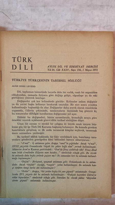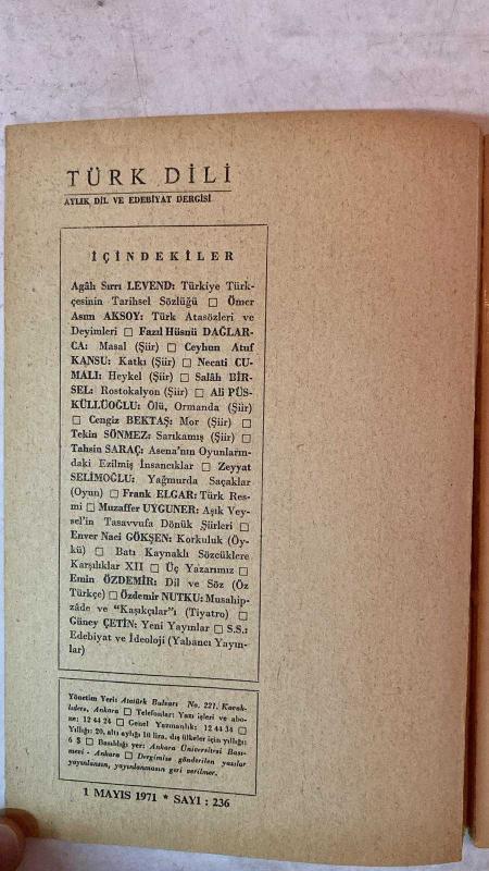 TÜRK DİLİ, AYLIK DİL VE YAZIN DERGİSİ - MAYIS 1971 SAYI: 236 AGÂH SIRRI LEVEND: TÜRKİYE TÜRKÇESİNİN TARİHSEL SÖZLÜĞÜ - ÖMER ASIM AKSOY: TÜRK ATASÖZLERİ VE DEYİMLERİ - FAZIL HÜSNÜ DAĞLARCA: MASAL - CEYHUN ATUF KANSU: KATKI - NECATİ CUMALI: HEYKEL - SALÂH BİRSEL: ROSTOKALYON - ALİ PÜSKÜLLÜOĞLU: ÖLÜ, ORMANDA - CENGİZ BEKTAŞ: MOR - ZEYYAT TEKİN SÖNMEZ: SARIKAMIŞ - TAHSİN SARAÇ: ASENA’NIN OYUNLARINDAKİ EZİLMİŞ İNSANCIKLAR - SELİMOĞLU: YAĞMURDA SAÇAKLAR - FRANK ELGAR: TÜRK RESMİ - MUZAFFER UYGUNER: ÂŞIK VEYSEL’İN TASAVVUFA DÖNÜK ŞİİRLERİ - ENVER NACİ GÖKŞEN: KORKULUK - BATI KAYNAKLI SÖZCÜKLERE KARŞILIKLAR XII - ÜÇ YAZARIMIZ: (ESER BAŞLIĞI BELİRTİLMEMİŞ) - EMİN ÖZDEMİR: DİL VE SÖZ (ÖZ TÜRKÇE) - ÖZDEMİR NUTKU: MUSAHİPZÂDE VE “KAŞIKÇILAR”I - GÜNEY ÇETİN: YENİ YAYINLAR - S. S.: EDEBİYAT VE İDEOLOJİ - 72 SAYFA, ŞERAFETTİN TURAN tarafından kaleme alınmıştır. Eser CAHİT KÜLEBİ editörlüğünde hazırlanmıştır. TÜRK DİLİ, AYLIK DİL VE YAZIN DERGİSİ - MAYIS 1971 SAYI: 236 AGÂH SIRRI LEVEND: TÜRKİYE TÜRKÇESİNİN TARİHSEL SÖZLÜĞÜ - ÖMER ASIM AKSOY: TÜRK ATASÖZLERİ VE DEYİMLERİ - FAZIL HÜSNÜ DAĞLARCA: MASAL - CEYHUN ATUF KANSU: KATKI - NECATİ CUMALI: HEYKEL - SALÂH BİRSEL: ROSTOKALYON - ALİ PÜSKÜLLÜOĞLU: ÖLÜ, ORMANDA - CENGİZ BEKTAŞ: MOR - ZEYYAT TEKİN SÖNMEZ: SARIKAMIŞ - TAHSİN SARAÇ: ASENA’NIN OYUNLARINDAKİ EZİLMİŞ İNSANCIKLAR - SELİMOĞLU: YAĞMURDA SAÇAKLAR - FRANK ELGAR: TÜRK RESMİ - MUZAFFER UYGUNER: ÂŞIK VEYSEL’İN TASAVVUFA DÖNÜK ŞİİRLERİ - ENVER NACİ GÖKŞEN: KORKULUK - BATI KAYNAKLI SÖZCÜKLERE KARŞILIKLAR XII - ÜÇ YAZARIMIZ: (ESER BAŞLIĞI BELİRTİLMEMİŞ) - EMİN ÖZDEMİR: DİL VE SÖZ (ÖZ TÜRKÇE) - ÖZDEMİR NUTKU: MUSAHİPZÂDE VE “KAŞIKÇILAR”I - GÜNEY ÇETİN: YENİ YAYINLAR - S. S.: EDEBİYAT VE İDEOLOJİ - 72 SAYFA adlı eser Türkçe dilindedir.
