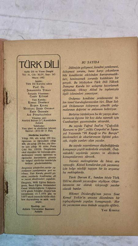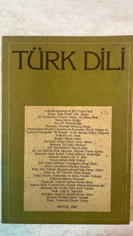 TÜRK DİLİ, AYLIK DİL VE YAZIN DERGİSİ - MAYIS 1982 SAYI: 365 TUĞRUL İNAL - NAHİT ULVİ AKGÜN - İLHAN BERK - METİN ELOĞLU - ALİ PÜSKÜLLÜOĞLU - MEHMET SEYDA - TARIK DURSUN K. - YILDIZ CANPOLAT - ALİ YÜCE - BİLGİN ADALI - ÖMER ASIM AKSOY - FAKİR BAYKURT - HAYATİ BAKİ - YUNUS KORAY - HİKMET DİZDAROĞLU - ALİ F. BİLİR - HALİL KÖKSEL - SEVGİ ÖZEL - HAYDAR ERGÜLEN - OKTAY AKBAL - İLHAN SELÇUK - YALÇIN ULUKAYA - MURAT ÖZTURANLI - SEVDA ŞENER - GÜLŞEN KARAKADIOĞLU - ÂLİM ŞERİF ONARAN - TALİP APAYDIN - RAMİS DARA - İSMAİL CEYHAN - ÖZCAN YALIM ÇAĞCILLIK KAVRAMI VE ŞİİR - HASAN DAĞI - EL YAZILARINA VURUYOR GÜNEŞ, III - SALÇA - ANI - ROMANCI GÜNLÜĞÜ - ROMANLARIN ERKEKLERİ KADINLARIN ROMANLARI - İSPANYOL YAZININDA "98 KUŞAĞI" VE PIO BAROJA - YOLKESEN - SÜRGÜN - DERSİMİZ TÜRKÇE - BABAMIN İŞİ - ÇÖL GÖRÜNÜMLERİ - BİR ACI KALMIŞ ERİK AĞACININ DALINDA - DENEMECİ SUUT KEMAL YETKİN - GECENİN ERİKLERİ - YARIM SABAH - ELLİ YILDA DİLBİLGİSİ ÇALIŞMALARI - EREN’E GÜZELLEME - TÜRK - TAM TAKIM EKSİKSİZ 62 SAYFA, ŞERAFETTİN TURAN tarafından kaleme alınmıştır. Eser CAHİT KÜLEBİ editörlüğünde hazırlanmıştır. TÜRK DİLİ, AYLIK DİL VE YAZIN DERGİSİ - MAYIS 1982 SAYI: 365 TUĞRUL İNAL - NAHİT ULVİ AKGÜN - İLHAN BERK - METİN ELOĞLU - ALİ PÜSKÜLLÜOĞLU - MEHMET SEYDA - TARIK DURSUN K. - YILDIZ CANPOLAT - ALİ YÜCE - BİLGİN ADALI - ÖMER ASIM AKSOY - FAKİR BAYKURT - HAYATİ BAKİ - YUNUS KORAY - HİKMET DİZDAROĞLU - ALİ F. BİLİR - HALİL KÖKSEL - SEVGİ ÖZEL - HAYDAR ERGÜLEN - OKTAY AKBAL - İLHAN SELÇUK - YALÇIN ULUKAYA - MURAT ÖZTURANLI - SEVDA ŞENER - GÜLŞEN KARAKADIOĞLU - ÂLİM ŞERİF ONARAN - TALİP APAYDIN - RAMİS DARA - İSMAİL CEYHAN - ÖZCAN YALIM ÇAĞCILLIK KAVRAMI VE ŞİİR - HASAN DAĞI - EL YAZILARINA VURUYOR GÜNEŞ, III - SALÇA - ANI - ROMANCI GÜNLÜĞÜ - ROMANLARIN ERKEKLERİ KADINLARIN ROMANLARI - İSPANYOL YAZININDA "98 KUŞAĞI" VE PIO BAROJA - YOLKESEN - SÜRGÜN - DERSİMİZ TÜRKÇE - BABAMIN İŞİ - ÇÖL GÖRÜNÜMLERİ - BİR ACI KALMIŞ ERİK AĞACININ DALINDA - DENEMECİ SUUT KEMAL YETKİN - GECENİN ERİKLERİ - YARIM SABAH - ELLİ YILDA DİLBİLGİSİ ÇALIŞMALARI - EREN’E GÜZELLEME - TÜRK - TAM TAKIM EKSİKSİZ 62 SAYFA adlı eser Türkçe dilindedir.