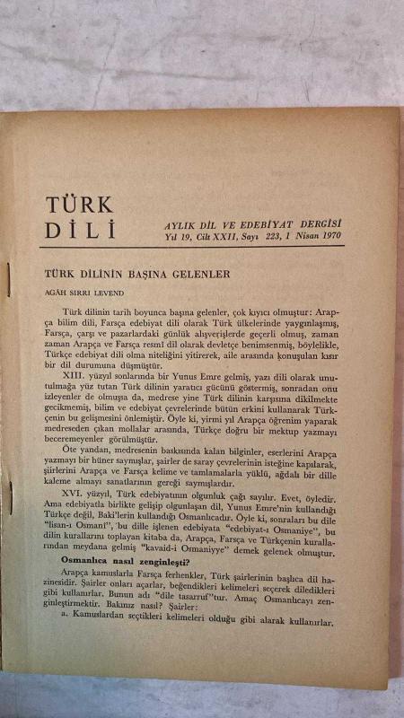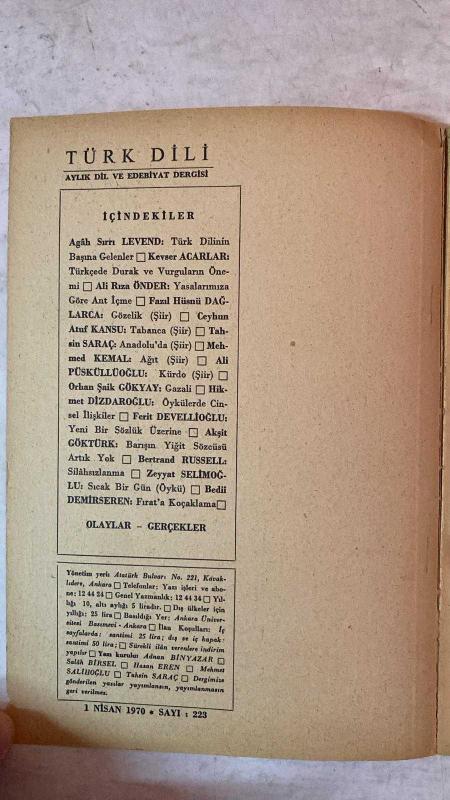 TÜRK DİLİ, AYLIK DİL VE YAZIN DERGİSİ - NİSAN 1970 SAYI: 223 AGÂH SIRRI LEVEND: TÜRK DİLİNİN BAŞINA GELENLER - KEVSER ACARLAR: TÜRKÇEDE DURAK VE VURGULARIN ÖNEMİ - ALİ RIZA ÖNDER: YASALARIMIZA GÖRE ANT İÇME - FAZIL HÜSNÜ DAĞLARCA: GÖZELİK - CEYHUN ATUF KANSU: TABANCA - TAHŞİN SARAÇ: ANADOLU'DA - MEHMET KEMAL: AĞIT - ALİ PÜSKÜLLÜOĞLU: KÜRDO - ORHAN ŞAİK GÖKYAY: GAZALİ - HİKMET DİZDAROĞLU: ÖYKÜLERDE CİNSEL İLİŞKİLER - FERİT DEVELLİOĞLU: YENİ BİR SÖZLÜK ÜZERİNE - AKŞİT GÖKTÜRK: BARIŞI YİĞİT SÖZCÜSÜ ARTIK YOK - BERTRAND RUSSELL: SİLAHSIZLANMA - ZEYYAT SELİMOĞLU: SICAK BİR GÜN - BEDİİ DEMİRSEREN: FIRAT'A KOÇAKLAMA - 60 SAYFA, ŞERAFETTİN TURAN tarafından kaleme alınmıştır. Eser CAHİT KÜLEBİ editörlüğünde hazırlanmıştır. TÜRK DİLİ, AYLIK DİL VE YAZIN DERGİSİ - NİSAN 1970 SAYI: 223 AGÂH SIRRI LEVEND: TÜRK DİLİNİN BAŞINA GELENLER - KEVSER ACARLAR: TÜRKÇEDE DURAK VE VURGULARIN ÖNEMİ - ALİ RIZA ÖNDER: YASALARIMIZA GÖRE ANT İÇME - FAZIL HÜSNÜ DAĞLARCA: GÖZELİK - CEYHUN ATUF KANSU: TABANCA - TAHŞİN SARAÇ: ANADOLU'DA - MEHMET KEMAL: AĞIT - ALİ PÜSKÜLLÜOĞLU: KÜRDO - ORHAN ŞAİK GÖKYAY: GAZALİ - HİKMET DİZDAROĞLU: ÖYKÜLERDE CİNSEL İLİŞKİLER - FERİT DEVELLİOĞLU: YENİ BİR SÖZLÜK ÜZERİNE - AKŞİT GÖKTÜRK: BARIŞI YİĞİT SÖZCÜSÜ ARTIK YOK - BERTRAND RUSSELL: SİLAHSIZLANMA - ZEYYAT SELİMOĞLU: SICAK BİR GÜN - BEDİİ DEMİRSEREN: FIRAT'A KOÇAKLAMA - 60 SAYFA adlı eser Türkçe dilindedir.