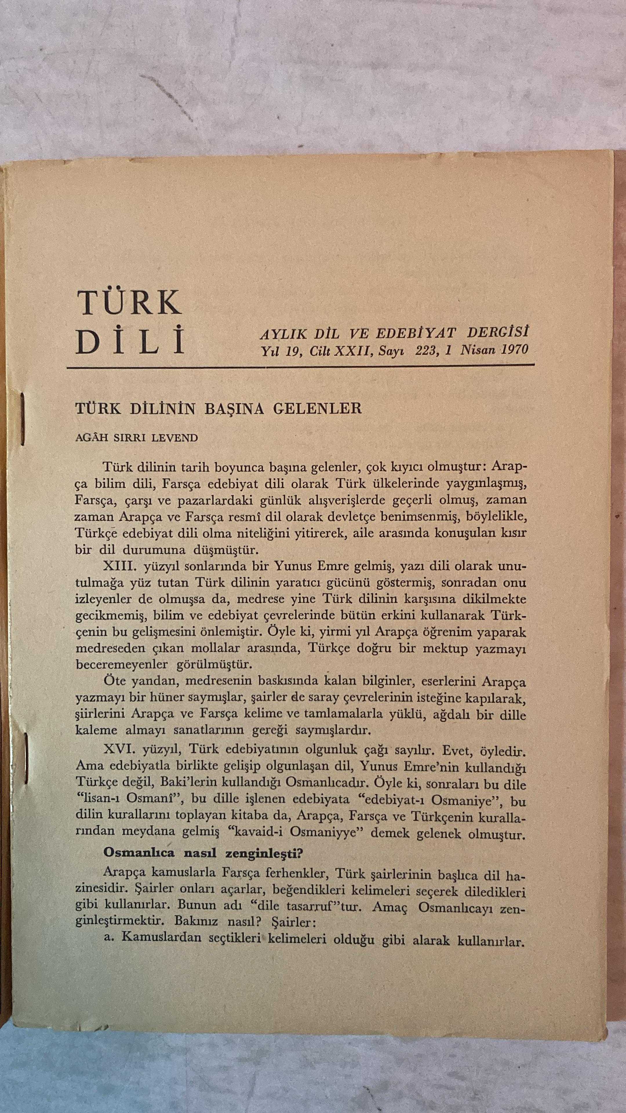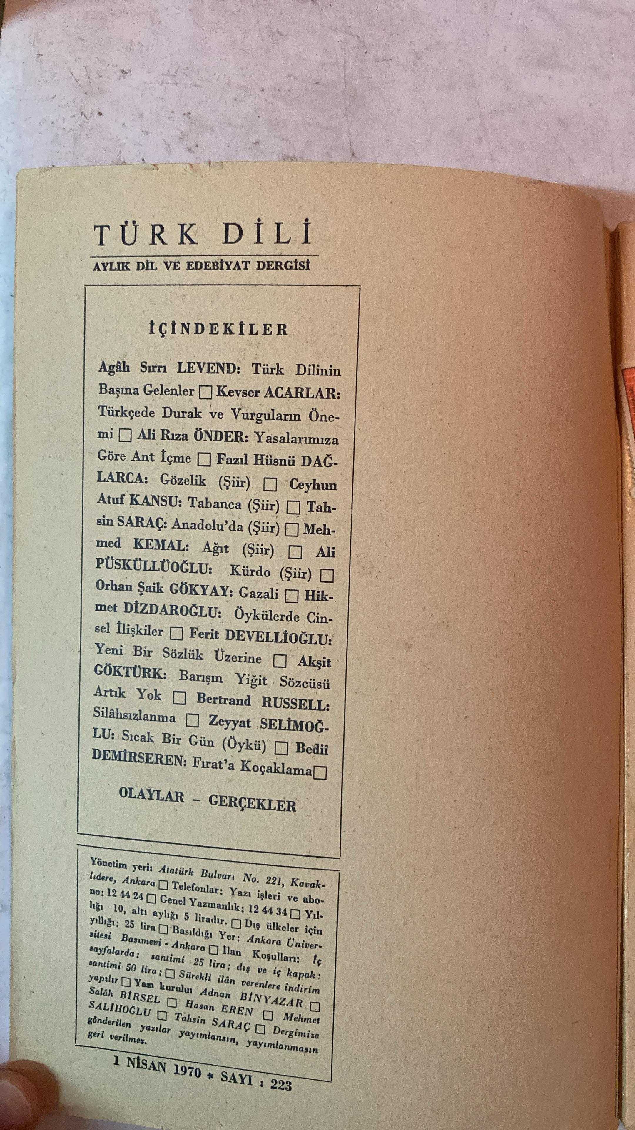 TÜRK DİLİ, AYLIK DİL VE YAZIN DERGİSİ - NİSAN 1970 SAYI: 223 AGÂH SIRRI LEVEND: TÜRK DİLİNİN BAŞINA GELENLER - KEVSER ACARLAR: TÜRKÇEDE DURAK VE VURGULARIN ÖNEMİ - ALİ RIZA ÖNDER: YASALARIMIZA GÖRE ANT İÇME - FAZIL HÜSNÜ DAĞLARCA: GÖZELİK - CEYHUN ATUF KANSU: TABANCA - TAHŞİN SARAÇ: ANADOLU'DA - MEHMET KEMAL: AĞIT - ALİ PÜSKÜLLÜOĞLU: KÜRDO - ORHAN ŞAİK GÖKYAY: GAZALİ - HİKMET DİZDAROĞLU: ÖYKÜLERDE CİNSEL İLİŞKİLER - FERİT DEVELLİOĞLU: YENİ BİR SÖZLÜK ÜZERİNE - AKŞİT GÖKTÜRK: BARIŞI YİĞİT SÖZCÜSÜ ARTIK YOK - BERTRAND RUSSELL: SİLAHSIZLANMA - ZEYYAT SELİMOĞLU: SICAK BİR GÜN - BEDİİ DEMİRSEREN: FIRAT'A KOÇAKLAMA - 60 SAYFA, ŞERAFETTİN TURAN tarafından kaleme alınmıştır. Eser CAHİT KÜLEBİ editörlüğünde hazırlanmıştır. TÜRK DİLİ, AYLIK DİL VE YAZIN DERGİSİ - NİSAN 1970 SAYI: 223 AGÂH SIRRI LEVEND: TÜRK DİLİNİN BAŞINA GELENLER - KEVSER ACARLAR: TÜRKÇEDE DURAK VE VURGULARIN ÖNEMİ - ALİ RIZA ÖNDER: YASALARIMIZA GÖRE ANT İÇME - FAZIL HÜSNÜ DAĞLARCA: GÖZELİK - CEYHUN ATUF KANSU: TABANCA - TAHŞİN SARAÇ: ANADOLU'DA - MEHMET KEMAL: AĞIT - ALİ PÜSKÜLLÜOĞLU: KÜRDO - ORHAN ŞAİK GÖKYAY: GAZALİ - HİKMET DİZDAROĞLU: ÖYKÜLERDE CİNSEL İLİŞKİLER - FERİT DEVELLİOĞLU: YENİ BİR SÖZLÜK ÜZERİNE - AKŞİT GÖKTÜRK: BARIŞI YİĞİT SÖZCÜSÜ ARTIK YOK - BERTRAND RUSSELL: SİLAHSIZLANMA - ZEYYAT SELİMOĞLU: SICAK BİR GÜN - BEDİİ DEMİRSEREN: FIRAT'A KOÇAKLAMA - 60 SAYFA adlı eser Türkçe dilindedir.