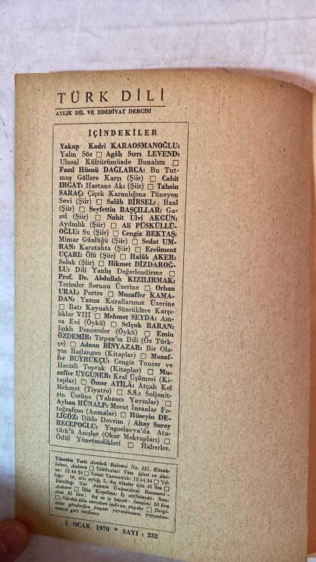 TÜRK DİLİ, AYLIK DİL VE YAZIN DERGİSİ - OCAK 1971 SAYI: 232 YAKUP KADRİ KARAOSMANOĞLU: YALIN SÖZ - AGÂH SIRRI LEVEND: ULUSAL KÜLTÜRÜMÜZDE BUNALIM - FAZIL HÜSNÜ DAĞLARCA: BU TUTMUŞ GÖLLERE KARŞI - CAHİT IRGAT: HASTANE AKI - TAHSİN SARAÇ: ÇİÇEK KARANLIĞINA TÜNEYEN SEVİ - SALÂH BİRSEL: BAAL - SEYFETTİN BAŞÇILLAR: GAZEL - NAHİT ÜLVİ AKGÜN: AYDINLIK - ALİ PÜSKÜLLÜOĞLU: SU - CENGİZ BEKTAŞ: MİMAR GÜNLÜĞÜ - SEDAT UMRAN: KARATAHTA - ERCÜMENT UÇARI: ÖLÜ - HALÛK AKER: SOLUK - HİKMET DİZDAROĞLU: DİLİ YANLIŞ DEĞERLENDİRME - ABDULLAH KIZILIRMAK: TERİMLER SORUNU ÜZERİNE - ORHAN URAL: PORTRE - MUZAFFER KAMADAN: YAZIM KURALLARIMIZ ÜZERİNE, BATI KAYNAKLI SÖZCÜKLERE KARŞILIKLAR VIII - MEHMET SEYDA: AMCA EVİ - SELÇUK BARAN: IŞIKLI PENCERELER - EMİN ÖZDEMİR: TIRPAN’IN DİLİ (ÖZ TÜRKÇE) - ADNAN BİNYAZAR: BİR OLAYIN BAŞLANGICI - MUZAFFER BUYRUKÇU: CENGİZ TUNCER VE HACİZLİ TOPRAK - MUZAFFER UYGUNER: KRAL UŞÜMESİ - ÖMER ATİLA: ATÇALI KEL MEHMET - S. S.: SOLJENİTZİN ÜSTÜNE - AYHAN HUNALP: MESUT İNSA - 60 SAYFA, ŞERAFETTİN TURAN tarafından kaleme alınmıştır. Eser CAHİT KÜLEBİ editörlüğünde hazırlanmıştır. TÜRK DİLİ, AYLIK DİL VE YAZIN DERGİSİ - OCAK 1971 SAYI: 232 YAKUP KADRİ KARAOSMANOĞLU: YALIN SÖZ - AGÂH SIRRI LEVEND: ULUSAL KÜLTÜRÜMÜZDE BUNALIM - FAZIL HÜSNÜ DAĞLARCA: BU TUTMUŞ GÖLLERE KARŞI - CAHİT IRGAT: HASTANE AKI - TAHSİN SARAÇ: ÇİÇEK KARANLIĞINA TÜNEYEN SEVİ - SALÂH BİRSEL: BAAL - SEYFETTİN BAŞÇILLAR: GAZEL - NAHİT ÜLVİ AKGÜN: AYDINLIK - ALİ PÜSKÜLLÜOĞLU: SU - CENGİZ BEKTAŞ: MİMAR GÜNLÜĞÜ - SEDAT UMRAN: KARATAHTA - ERCÜMENT UÇARI: ÖLÜ - HALÛK AKER: SOLUK - HİKMET DİZDAROĞLU: DİLİ YANLIŞ DEĞERLENDİRME - ABDULLAH KIZILIRMAK: TERİMLER SORUNU ÜZERİNE - ORHAN URAL: PORTRE - MUZAFFER KAMADAN: YAZIM KURALLARIMIZ ÜZERİNE, BATI KAYNAKLI SÖZCÜKLERE KARŞILIKLAR VIII - MEHMET SEYDA: AMCA EVİ - SELÇUK BARAN: IŞIKLI PENCERELER - EMİN ÖZDEMİR: TIRPAN’IN DİLİ (ÖZ TÜRKÇE) - ADNAN BİNYAZAR: BİR OLAYIN BAŞLANGICI - MUZAFFER BUYRUKÇU: CENGİZ TUNCER VE HACİZLİ TOPRAK - MUZAFFER UYGUNER: KRAL UŞÜMESİ - ÖMER ATİLA: ATÇALI KEL MEHMET - S. S.: SOLJENİTZİN ÜSTÜNE - AYHAN HUNALP: MESUT İNSA - 60 SAYFA adlı eser Türkçe dilindedir.