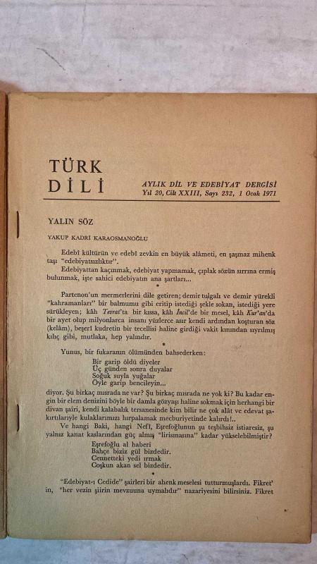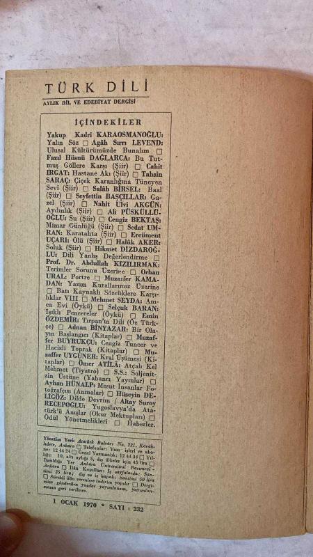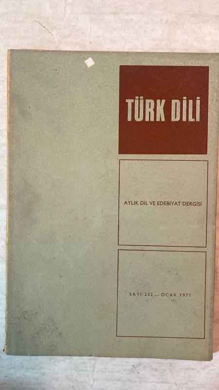 TÜRK DİLİ, AYLIK DİL VE YAZIN DERGİSİ - OCAK 1971 SAYI: 232 YAKUP KADRİ KARAOSMANOĞLU: YALIN SÖZ - AGÂH SIRRI LEVEND: ULUSAL KÜLTÜRÜMÜZDE BUNALIM - FAZIL HÜSNÜ DAĞLARCA: BU TUTMUŞ GÖLLERE KARŞI - CAHİT IRGAT: HASTANE AKI - TAHSİN SARAÇ: ÇİÇEK KARANLIĞINA TÜNEYEN SEVİ - SALÂH BİRSEL: BAAL - SEYFETTİN BAŞÇILLAR: GAZEL - NAHİT ÜLVİ AKGÜN: AYDINLIK - ALİ PÜSKÜLLÜOĞLU: SU - CENGİZ BEKTAŞ: MİMAR GÜNLÜĞÜ - SEDAT UMRAN: KARATAHTA - ERCÜMENT UÇARI: ÖLÜ - HALÛK AKER: SOLUK - HİKMET DİZDAROĞLU: DİLİ YANLIŞ DEĞERLENDİRME - ABDULLAH KIZILIRMAK: TERİMLER SORUNU ÜZERİNE - ORHAN URAL: PORTRE - MUZAFFER KAMADAN: YAZIM KURALLARIMIZ ÜZERİNE, BATI KAYNAKLI SÖZCÜKLERE KARŞILIKLAR VIII - MEHMET SEYDA: AMCA EVİ - SELÇUK BARAN: IŞIKLI PENCERELER - EMİN ÖZDEMİR: TIRPAN’IN DİLİ (ÖZ TÜRKÇE) - ADNAN BİNYAZAR: BİR OLAYIN BAŞLANGICI - MUZAFFER BUYRUKÇU: CENGİZ TUNCER VE HACİZLİ TOPRAK - MUZAFFER UYGUNER: KRAL UŞÜMESİ - ÖMER ATİLA: ATÇALI KEL MEHMET - S. S.: SOLJENİTZİN ÜSTÜNE - AYHAN HUNALP: MESUT İNSA - 60 SAYFA