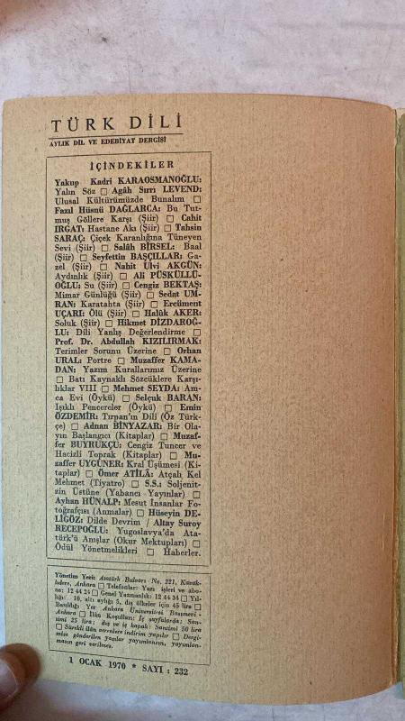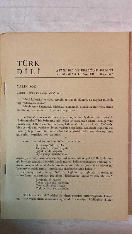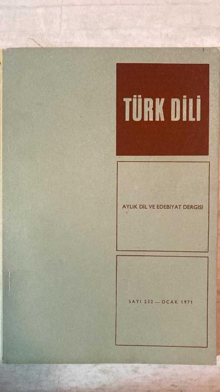 TÜRK DİLİ, AYLIK DİL VE YAZIN DERGİSİ - OCAK 1971 SAYI: 232 YAKUP KADRİ KARAOSMANOĞLU: YALIN SÖZ - AGÂH SIRRI LEVEND: ULUSAL KÜLTÜRÜMÜZDE BUNALIM - FAZIL HÜSNÜ DAĞLARCA: BU TUTMUŞ GÖLLERE KARŞI - CAHİT IRGAT: HASTANE AKI - TAHSİN SARAÇ: ÇİÇEK KARANLIĞINA TÜNEYEN SEVİ - SALÂH BİRSEL: BAAL - SEYFETTİN BAŞÇILLAR: GAZEL - NAHİT ÜLVİ AKGÜN: AYDINLIK - ALİ PÜSKÜLLÜOĞLU: SU - CENGİZ BEKTAŞ: MİMAR GÜNLÜĞÜ - SEDAT UMRAN: KARATAHTA - ERCÜMENT UÇARI: ÖLÜ - HALÛK AKER: SOLUK - HİKMET DİZDAROĞLU: DİLİ YANLIŞ DEĞERLENDİRME - ABDULLAH KIZILIRMAK: TERİMLER SORUNU ÜZERİNE - ORHAN URAL: PORTRE - MUZAFFER KAMADAN: YAZIM KURALLARIMIZ ÜZERİNE, BATI KAYNAKLI SÖZCÜKLERE KARŞILIKLAR VIII - MEHMET SEYDA: AMCA EVİ - SELÇUK BARAN: IŞIKLI PENCERELER - EMİN ÖZDEMİR: TIRPAN’IN DİLİ (ÖZ TÜRKÇE) - ADNAN BİNYAZAR: BİR OLAYIN BAŞLANGICI - MUZAFFER BUYRUKÇU: CENGİZ TUNCER VE HACİZLİ TOPRAK - MUZAFFER UYGUNER: KRAL UŞÜMESİ - ÖMER ATİLA: ATÇALI KEL MEHMET - S. S.: SOLJENİTZİN ÜSTÜNE - AYHAN HUNALP: MESUT İNSA - 60 SAYFA, ŞERAFETTİN TURAN tarafından kaleme alınmıştır. Eser CAHİT KÜLEBİ editörlüğünde hazırlanmıştır. TÜRK DİLİ, AYLIK DİL VE YAZIN DERGİSİ - OCAK 1971 SAYI: 232 YAKUP KADRİ KARAOSMANOĞLU: YALIN SÖZ - AGÂH SIRRI LEVEND: ULUSAL KÜLTÜRÜMÜZDE BUNALIM - FAZIL HÜSNÜ DAĞLARCA: BU TUTMUŞ GÖLLERE KARŞI - CAHİT IRGAT: HASTANE AKI - TAHSİN SARAÇ: ÇİÇEK KARANLIĞINA TÜNEYEN SEVİ - SALÂH BİRSEL: BAAL - SEYFETTİN BAŞÇILLAR: GAZEL - NAHİT ÜLVİ AKGÜN: AYDINLIK - ALİ PÜSKÜLLÜOĞLU: SU - CENGİZ BEKTAŞ: MİMAR GÜNLÜĞÜ - SEDAT UMRAN: KARATAHTA - ERCÜMENT UÇARI: ÖLÜ - HALÛK AKER: SOLUK - HİKMET DİZDAROĞLU: DİLİ YANLIŞ DEĞERLENDİRME - ABDULLAH KIZILIRMAK: TERİMLER SORUNU ÜZERİNE - ORHAN URAL: PORTRE - MUZAFFER KAMADAN: YAZIM KURALLARIMIZ ÜZERİNE, BATI KAYNAKLI SÖZCÜKLERE KARŞILIKLAR VIII - MEHMET SEYDA: AMCA EVİ - SELÇUK BARAN: IŞIKLI PENCERELER - EMİN ÖZDEMİR: TIRPAN’IN DİLİ (ÖZ TÜRKÇE) - ADNAN BİNYAZAR: BİR OLAYIN BAŞLANGICI - MUZAFFER BUYRUKÇU: CENGİZ TUNCER VE HACİZLİ TOPRAK - MUZAFFER UYGUNER: KRAL UŞÜMESİ - ÖMER ATİLA: ATÇALI KEL MEHMET - S. S.: SOLJENİTZİN ÜSTÜNE - AYHAN HUNALP: MESUT İNSA - 60 SAYFA adlı eser Türkçe dilindedir.