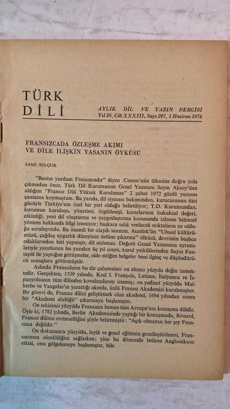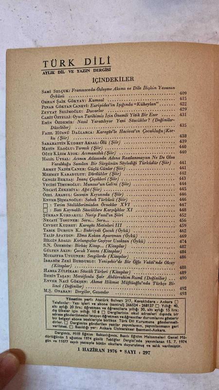 TÜRK DİLİ, AYLIK DİL VE YAZIN DERGİSİ - SAYI: 297 1 HAZİRAN 1976 - ORHAN ŞAİK GÖKYAY: KUMSAL - SAMİ SELÇUK: FRANSIZCADA ÖZLEŞME AKIMI VE DİLE İLİŞKİN YASANIN ÖYKÜSÜ - PINAR GÖKTAN CANEVİ: EURİPİDES'İN IŞIĞINDA ''KÜHEYLAN'' - ZEYYAT SELİMOĞLU: DUVARLAR - CAHİT ÖZTELLİ: OYUN TARİHİMİZ İÇİN ÖNEMLİ YİTİK BİR ESER - EMİN ÖZDEMİR: NASIL YARATILIYOR YENİ SÖZCÜKLER? - FAZIL HÜSNÜ DAĞLARCA: KARAGÖZ'LE HACİVAT'IN ÇOCUKLUĞU - SABAHATTİN KUDRET AKSAL: ÖLÜ - METİN ELOĞLU: TIRMIK - OĞUZ KAZIM ATOK: ACIMASIZLIK - HALİL UYSAL: ACININ ATLASINDA ADINA RASTLANMAYAN NE DE OLSA VAROLDUĞU SANILAN BİR SÜRGÜNÜN SÖYLEDİĞİ TÜRKÜDÜR - AHMET NADİR CANER: GÜÇLÜ GÜNLER - MEHMET KARABULUT: DÖRTLÜKLER - CENGİZ BEKTAŞ: İNANÇ ÇİÇEKLERİ - VECİHİ TİMUROĞLU: MUNZUR'UN GELİNİ - NECATİ ZEKERİYA: AĞIT - ŞÜKRAN KURDAKUL: NECİP FAZIL'IN ŞİİRİ - NECATİ TOSUNER: SORU.... SORU..... - CEVDET KUDREET: KARAGÖZ METİNLERİ 3 - TARIK DURSUN K.: BAHRİYELİ ÇOCUK- 64 SAYFA adlı eser, Kitap > Süreli Yayınlar > Dergiler > Siyaset kategorisinde İkinci El olarak satıştadır.