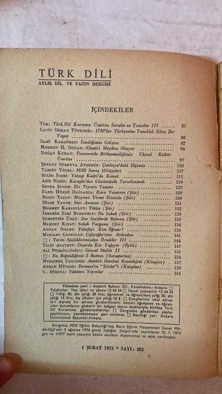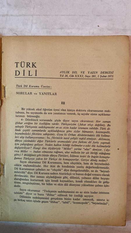 TÜRK DİLİ, AYLIK DİL VE YAZIN DERGİSİ - ŞUBAT 1975 SAYI: 281 TDK : TÜRK DİL KURUMU ÜZERİNE SORULAR VE YANITLAR III - CAVİT ORHAN TÜTENGİL : 1730'LAR TÜRKÇESİNE TANIKLIK EDEN BİR YAPIT - SAMİ KARAÖREN : İSTEDİĞİMİZ GELİŞME - MEHMET H. DOĞAN : ELEŞTİRİ MEYDAN OKUYOR - DOĞAN KUBAN : TANIMINDA BİRLEŞEMEDİĞİMİZ ULUSAL KÜLTÜR ÜZERİNE - ŞEVKET SÜREYYA AYDEMİR : ÇANKAYA'DAKİ ELÇİMİZ - TAHSİN YÜCEL : MİLLİ SAVAŞ HİKÂYELERİ - SELİM İLERİ : YAKUP KADRİ'DE KONAK - AZİZ NESİN : KARAGÖZ'DEN GÜNÜMÜZDE YARARLANMAK - SEVDA ŞENER : BİR TİYATRO TANIMI - FAZIL HÜSNÜ DAĞLARCA : KARA YANSIMA - BERİN TAŞAN : MAYISIN YİRMİ İKİSİNDE - HİLMİ YAVUZ : SARI ANASTAS - MEHMET KARABULUT : TÜTÜN - İBRAHİM ZEKİ BURDURLU : BU SABAH - ŞEMSETTİN ÜNLÜ : DAR GEÇİTLERDE RAHVAN - MEHMET KIYAT : SABAH VURGUNU - ADNAN ONART : FELSEFEYİ KİM ÖĞRETİR? - MUSTAFA CANPOLAT : CAFEROĞLU'NUN ARDINDAN - TALİP APAYDIN : DIŞARDA KAR YAĞIYOR - ALİ PÜSKÜLLÜOĞLU : GÜNCEL SÖZLÜK II - AYHAN HÜNALP : DİRANAS'IN "ŞİİRLER"İ - MUZAFFER 76 SAYFA adlı eser, Kitap > Süreli Yayınlar > Dergiler > Siyaset kategorisinde İkinci El olarak satıştadır.