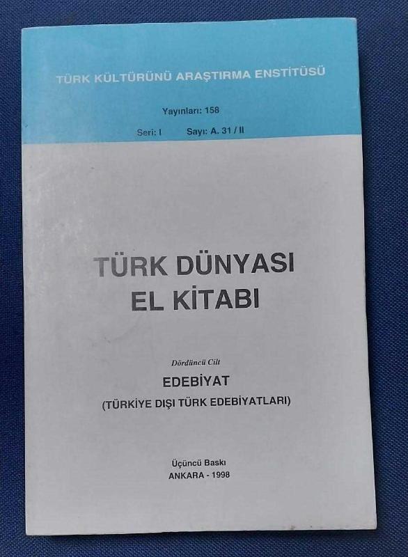 Kitap 1998 yılında TÜRK KÜLTÜRÜNÜ ARAŞTIRMA ENSTİTÜSÜ tarafından [ANKARA] yayınlanmıştır. 512 sayfadır. TÜRK DÜNYASI EL KİTABI 4. CİLT EDEBİYAT (TÜRKİYE DIŞI TÜRK EDEBİYATLARI) adlı eser Türkçe dilindedir.