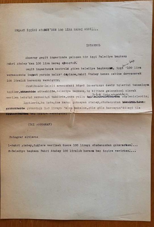 TÜRK HEKİM ve SİYASETÇİ, 1968-1973 İSTANBUL BELEDİYE BAŞKANI DOKTOR FAHRİ ATABEY'İN ORİJİNAL BÜYÜK BOY FOTOĞRAFI (HABER METİNİ SAYFASIYLA BİRLİKTE, 2'Lİ SET HALİNDE) - 24 x 18 cm EBADINDA - DR. FAHRİ ATABEY, AKSARAY GEÇİT İNŞAATI ŞANTİYE ALANINI KONTROL EDERKEN YANINA GELEN BİR İŞÇİ KENDİSİNE ŞAKAYLA ''100 LİRA VERMEZSENİZ İNŞAAT YARIDA KALIR'' DEMESİ ÜZERİNE SAYIN DR. FAHRİ ATABEY CEBİNDEN 100 LİRA ÇIKARIP İŞÇİYE VERMİŞTİR. BU GÜZEL ANLARDA KAYDEDİLMİŞ BİR KARE + HABER METNİ SAYFASI, 4 gün önce satışa sunulmuştur.