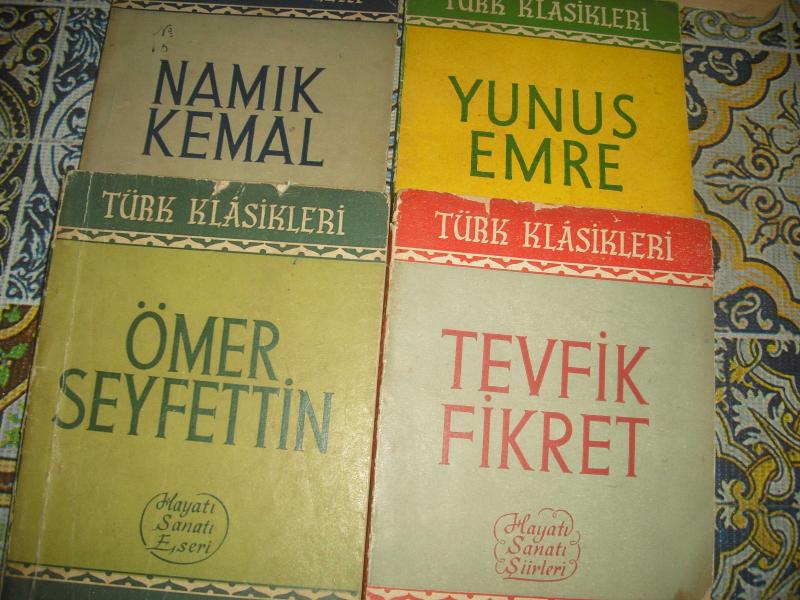1-TEVFİK FİKRET HAYATI SANATI ŞİİRLERİ ..HAZIRLAYAN:YAŞAR NABİ..122 SAYFA ..BU KİTAP YIPRANMIŞ, ARKA KAPAĞI YOK 2-YUNUS EMRE HAYATI SANATI ŞİİRLERİ ..HAZ: ABDÜLBAKİ GÖLPINARLI..120 SAYFA 3-ÖMER SEYFETTİN HAYATI SANATI ESERLERİ ..HAZ. YAŞAR NABİ..127 SAYFA 4-NAMIK KEMAL HAYATI SANATI ESERLERİ..HAZ.HİKMET DİZDAROĞLU..124 SAYFA