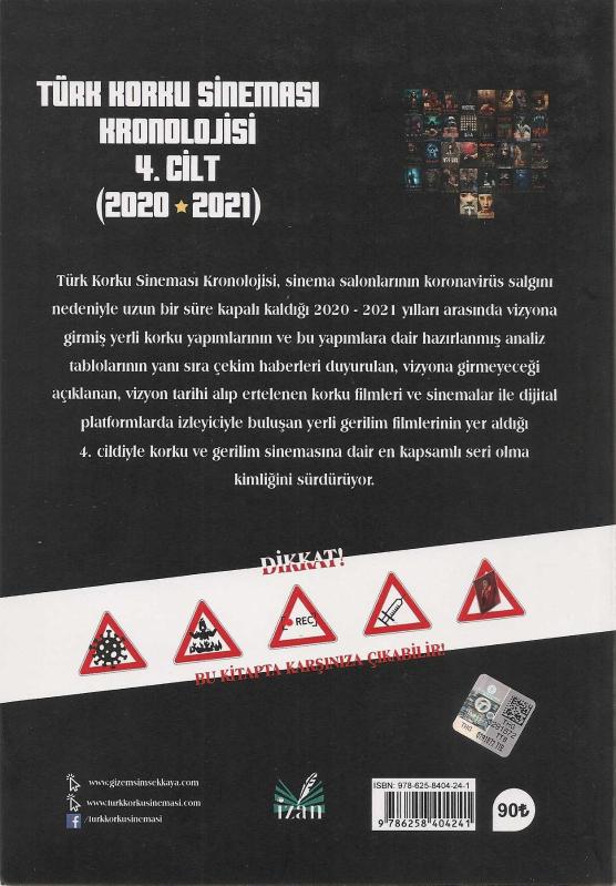 TÜRK KORKU SİNEMASI KRONOJİSİ Sinema salonlarının koronavirüs salgını nedeniyle uzun bir süre kapalı kaldığı 2020-2021 yılları arasında vizyona girmiş yerli korku yapımlarının ve bu yapımlara dair hazırlanmış analiz tablolarının yanı sıra çekim haberleri duyurulan, vizyona girmeyeceği açıklanan, vizyon tarihi alıp ertelenen korku filmleri ve sinemalar ile dijital platformlarda izleyiciyle buluşan yerli gerilim filmlerinin yer aldığı 4. cildiyle korku ve gerilim sinemasına dair en kapsamlı seri olma kimliğini sürdürüyor.