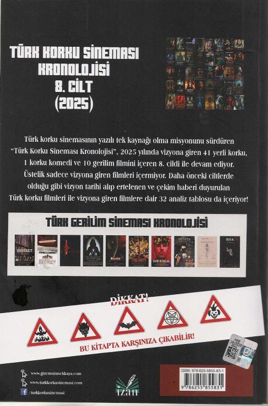 Türk korku sinemasının yazılı tek kaynağı olma misyonunu sürdüren « Türk Korku Sineması Kronolojisi », 2025 yılında vizyona giren 41 yerli korku, 1 korku komedi ve 10 gerilim filmini içeren 8. cildi ile devam ediyor. Üstelik sadece vizyona giren filmleri içermiyor. Daha önceki ciltlerde olduğu gibi vizyon tarihi alıp ertelenen ve çekim haberi duyurulan Türk korku filmleri ile vizyona giren filmlere dair 32 analiz tablosunu da içeriyor!