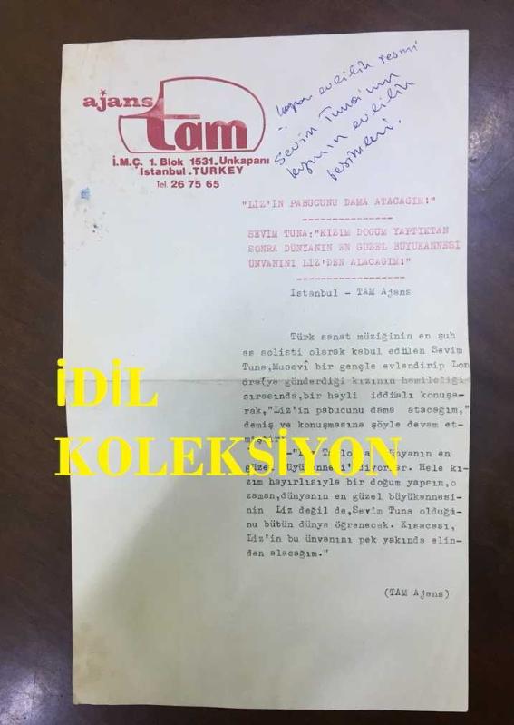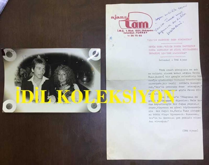 TÜRK SANAT MÜZİĞİ SANATÇISI SEVİM TUNA'NIN KIZI CANAN'IN EVLENDİĞİ GENÇLE ÇEKİLMİŞ ORİJİNAL BİR FOTOĞRAFI ve TAM AJANS'IN BU KONUDA YAZILMIŞ ORİJİNAL HABER METNİ, 2'Lİ SET - FOTOĞRAF 18 x 12 cm, HABER METNİ 29 x 17 cm EBADINDA -SEVİM TUNA: ''KIZIM DOĞUM YAPTIKTAN SONRA DÜNYANIN EN GÜZEL BÜYÜKANNESİ ÜNVANINI LİZ'DEN ALACAĞIM'' DEDİ, 2 ay önce satışa sunulmuştur.