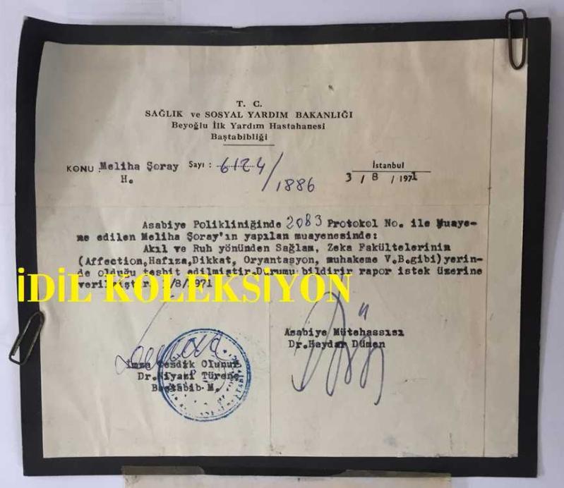 TÜRKAN ŞORAY'IN ANNESİ MELİHA SAV'IN (ÇILGIN MELOŞ) ORİJİNAL SAĞLIK RAPORU - 17 x 14 cm EBADINDA - BEYOĞLU İLK YARDIM HASTAHANESİ BAŞTABİPLİĞİ, MELİHA ŞORAY, 3 AĞUSTOS 1971 - DR. NİYAZİ TÜRENE ve DR. HAYDAR DÜMEN TARAFINDAN MÜŞTEREK ISLAK İMZALI, ORİJİNAL BELGE, 4 ay önce satışa sunulmuştur.
