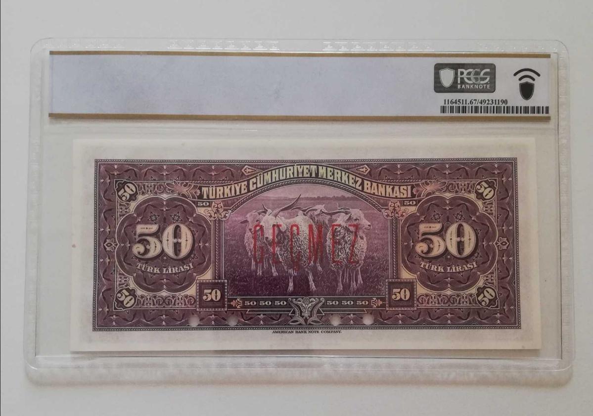 1930 tarihli 50 Türk Lirası, 3. Emisyon / 1. Tertip nadir bir SPECIMEN (numune) banknottur. 🔹 Emisyon: 3. Emisyon 🔹 Tertip: 1. Tertip 🔹 Tarih: L.1930 🔹 Seri: E1-00000 🔹 SPECIMEN (numune, delgeç iptalli) 🔹 Overprint: Kırmızı “GEÇMEZ” 🔹 Basım: ABNC (American Bank Note Company) 🔹 Derece: PCGS 67 PPQ (Superb Gem UNC) 🔹 Population: 1 (Bu kalitede kayıtlı tek örnek, daha üst derece yok) Banknot, PCGS tarafından sertifikalıdır ve orijinalliği garanti altındadır. Sertifika numarası ile sistem üzerinden doğrulama yapılabilir. 📌 Erken Cumhuriyet dönemi, 3. Emisyonun en üst kalite specimen örneklerinden biridir. 📈 Hem nadirlik hem kondisyon açısından üst segment koleksiyonluk seviyededir. 🎯 Ciddi ve ileri seviye koleksiyonerlere hitap eder. Bu banknot, aynı derece ve özelliklerde PCGS kayıtlarında tek örnek (POP 1) olup koleksiyon piyasasında “üst segment / elite” kategoride değerlendirilmektedir. DİĞER ÜRÜNLERİMİZE'DE BAKMANIZI TAVSİYE EDERİZ SAYGILAR
