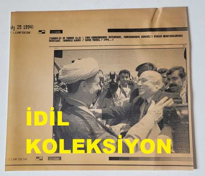 TÜRKİYE CUMHURİYETİ 9. CUMHURBAŞKANI SÜLEYMAN DEMİREL'İN AJANS-BASIN FOTOĞRAFI (KAĞIT BASKI) - 18 x 16 cm EBADINDA - SÜLEYMAN DEMİREL, İRAN ZİYARETİNDE İRAN CUMHURBAŞKANI HAŞİMİ RAFSANCANİ TARAFINDAN KARŞILANIRKEN ÇEKİLMİŞ BİR KARE, 1994, 16 saat önce satışa sunulmuştur.