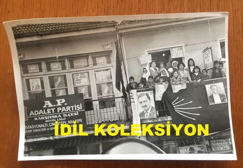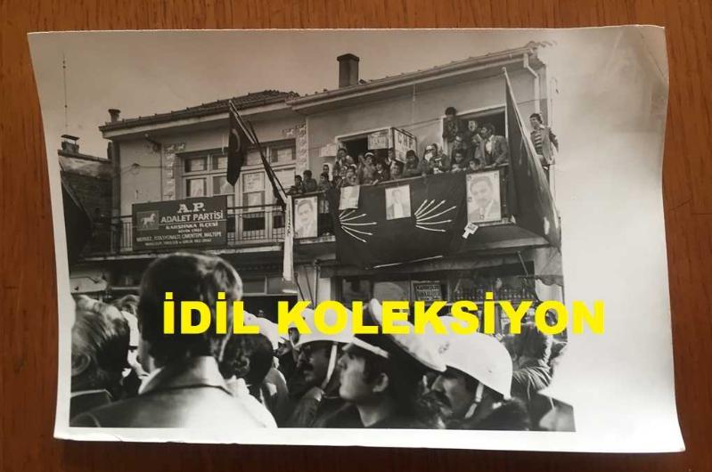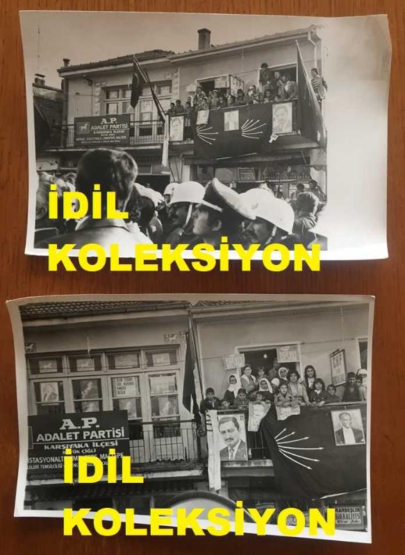 TÜRKİYE CUMHURİYETİ ESKİ BAŞBAKANI BÜLENT ECEVİT'İN MAHALLİ SEÇİMLER İÇİN GİTTİĞİ ÇİĞİLİ'DEKİ MİTİNGDE ADALET PARTİSİ (AP) KARŞIYAKA İLÇESİ BÜYÜK ÇİĞLİ TABELASI OLAN BİNA ve YAN BİNADA CHP BAYRAKLARIYLA MİTİNGİ İZLEYEN HALKI GÖSTEREN ORİJİNAL 2'Lİ AJANS-BASIN FOTOĞRAFI SETİ - 18 x 12 cm EBADINDA - 7 MAYIS 1977, 12 gün önce satışa sunulmuştur.
