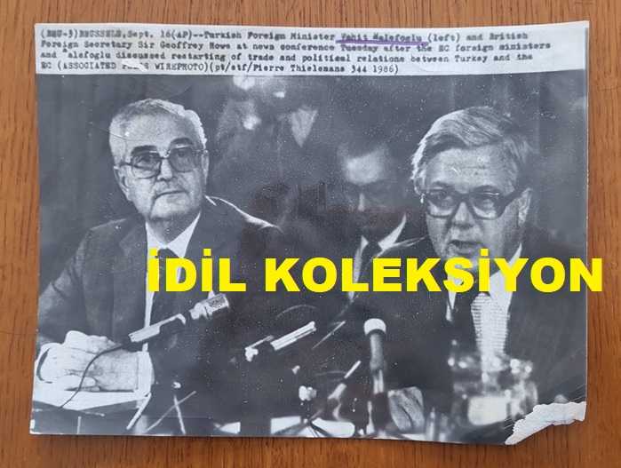 TÜRKİYE CUMHURİYETİ ESKİ DIŞİŞLERİ BAKANI VAHİT HALEFOĞLU'NUN ORİJİNAL AJANS-BASIN FOTOĞRAFI - 18 x 14 cm EBADINDA - VAHİT HALEFOĞLU, İNGİLTERE BAŞBAKANI YARDIMCISI GEOFFREY HOWE İLE BİRLİKTE BASIN AÇIKLAMASI YAPARKEN ÇEKİLMİŞ BİR KARE. 1986, en son 2 ay önce güncellenmiştir.