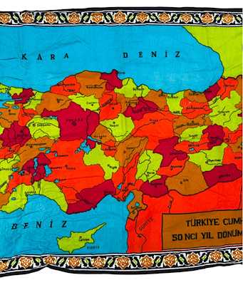 TÜRKİYE CUMHURİYETİNİN 50. YILINA ÖZEL YAPTIRILMIŞ ATATÜRK VE TÜRKİYE HARİTASI GÖRSELLİ ÇİL KONDİSYONDA DUVAR HALISI başlıklı antika/koleksiyon objesi Türkiye menşe’lidir. 1960-1979 arası dönemine aittir.