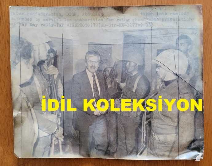 TÜRKİYE DEVRİMCİ İŞÇİ SENDİKALARI KONFEDERASYONU (DİSK) ESKİ GENEL BAŞKANLARINDAN SENDİKACI ABDULLAH BAŞTÜRK'ÜN ORİJİNAL BÜYÜK BOY AJANS BASIN FOTOĞRAFI - 25 x 20 cm EBADINDA - ABDULLAH BAŞTÜRK'ÜN ASKERLERİN ARASINDA KONTROL ALTINDA TUTULDUĞU ANLARDAN BİR KARE, İNGİLİZCE AJANS METNİ İLE. 12 EYLÜL SONRASI SÜREÇTE ABDULLAH ÖZTÜRK ve 51 DİSK YÖNETİCİSİNİN İDAMLARININ İSTENDİĞİ DURUŞMA. 26 HAZİRAN 1981, bir ay önce satışa sunulmuştur.