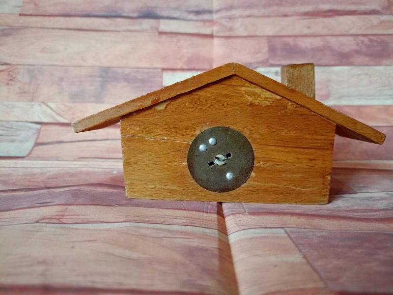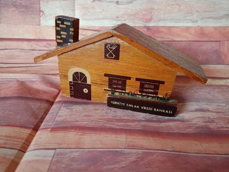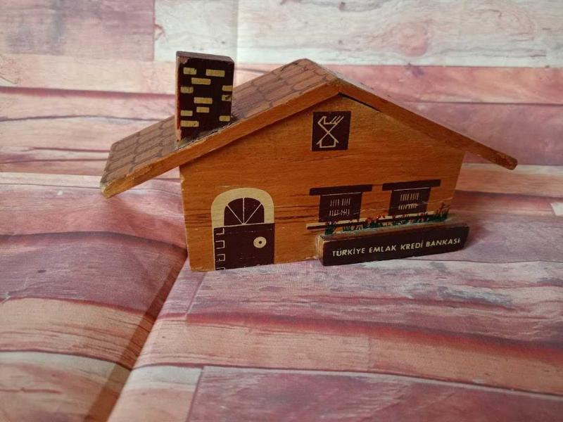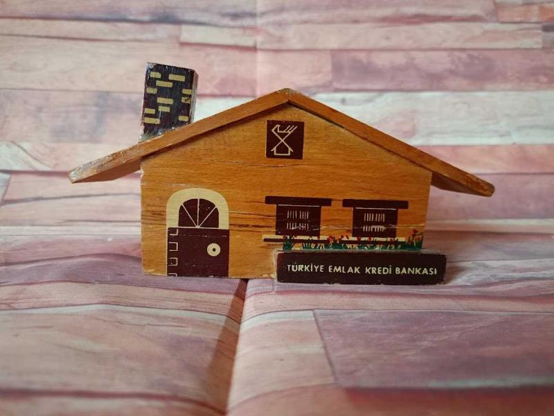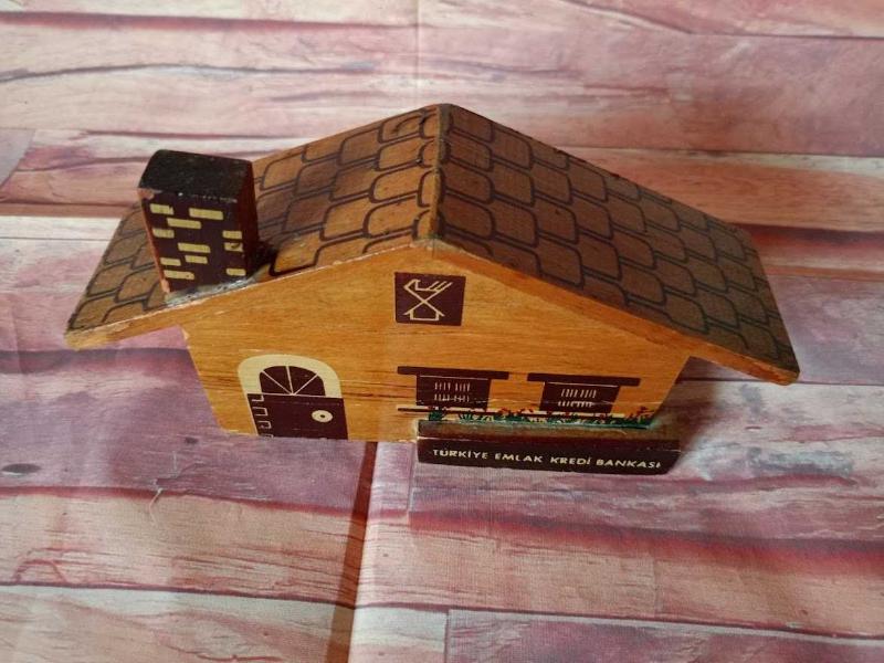 TÜRKİYE EMLAK KREDİ BANKASI EV FORMUNDA AHŞAP KUMBARA. başlıklı antika/koleksiyon objesi Türkiye menşe’lidir. 1960-1979 arası dönemine aittir.