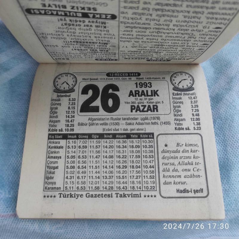 TÜRKİYE GAZETESİ TAKVİMİ 26 ARALIK 1993 - DOĞUM GÜNÜ HEDİYESİ HEDİYELİK TAKVİM YAPRAĞI, en son 1 yıl önce güncellenmiştir.