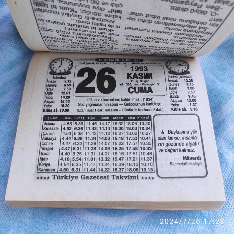 TÜRKİYE GAZETESİ TAKVİMİ 26 KASIM 1993 - DOĞUM GÜNÜ HEDİYESİ HEDİYELİK TAKVİM YAPRAĞI, en son 1 yıl önce güncellenmiştir.