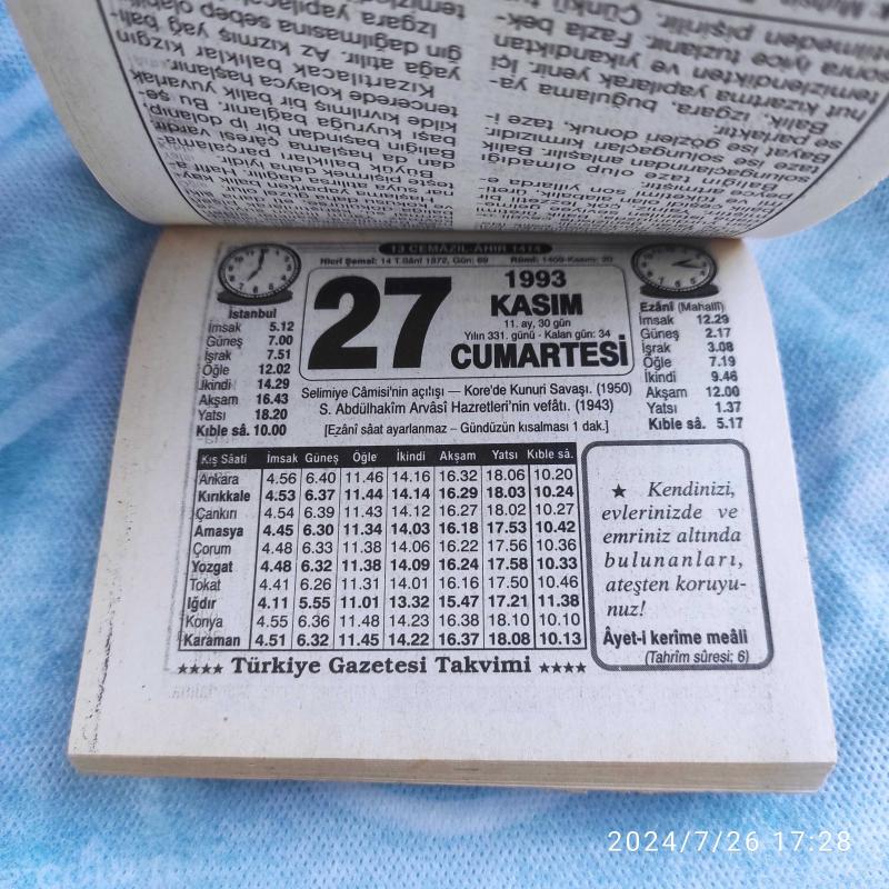 TÜRKİYE GAZETESİ TAKVİMİ 27 KASIM 1993 - DOĞUM GÜNÜ HEDİYESİ HEDİYELİK TAKVİM YAPRAĞI, en son 1 yıl önce güncellenmiştir.