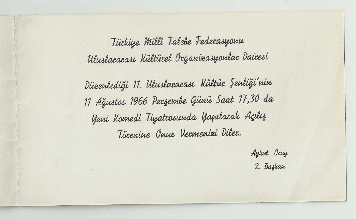 ** TÜRKİYE MİLLİ TALEBE FEDERASYONU XI.ULUSLARARASI KÜLTÜR ŞENLİĞİ DAVETİYESİ ** Kapalı olarak 16.5 x 9.7 cm.ebadında,açılır kapaklı ve gayet temiz durumda 1966 tarihli nadir davetiyedir..
