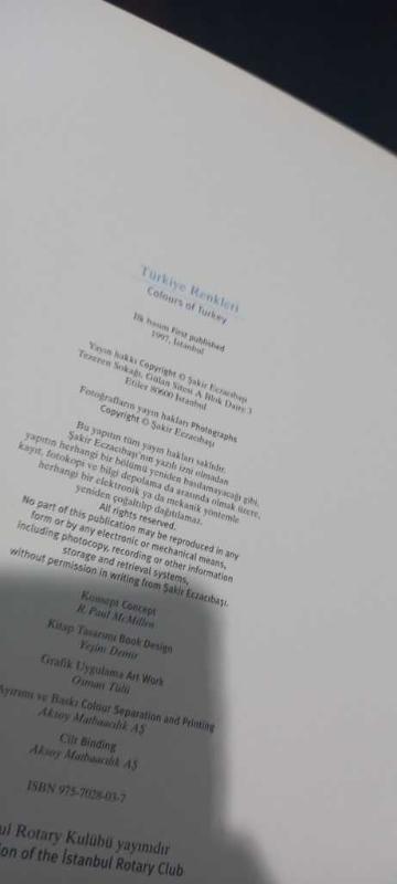 TÜRKİYE RENKLERİ - COLOURS OF TURKEY - METİN: ABİDİN DİNO -, ŞAKİR ECZACIBAŞI tarafından kaleme alınmıştır. Kitap 1997 yılında İSTANBUL ROTARY KULUBÜ tarafından [İstanbul] yayınlanmıştır. 203 sayfadır. TÜRKİYE RENKLERİ - COLOURS OF TURKEY - METİN: ABİDİN DİNO - adlı eser Türkçe dilindedir.