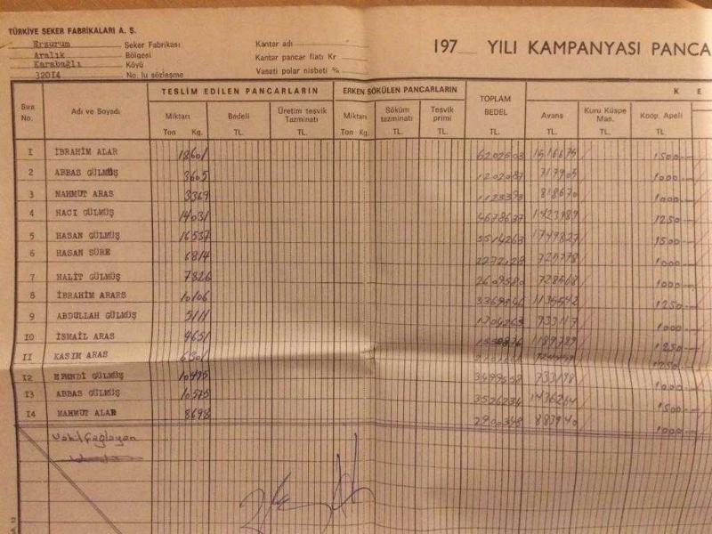 TÜRKİYE ŞEKER FABRİKALARI A.Ş. ERZURUM, ARALIK BÖLGESİ KARABAĞLI KÖYÜ 25 KİŞİNİN ALIM BORDROSU 1980Lİ YILLAR, 1 yıl önce satışa sunulmuştur.