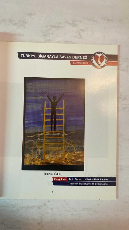 TÜRKİYE SİGARAYLA SAVAŞ DERNEĞİ DERGİSİ - 17 ŞUBAT 2012 — MUSTAFA AYDIN - KARINA MOLTCHANOVA SİGARA KALBİMİZİ KIRAR RESİM SERGİSİ - TÜRKİYE GENELİ LİSELER ARASI YARIŞMA - MİLLİ EĞİTİM BAKANLIĞI İŞBİRLİĞİ - 81 İLDE 5250 LİSEYE DUYURU - 2006 BAŞVURU - RESİM KATEGORİSİ SERGİSİ - ZONGULDAK EREĞLİ LİSESİ İKİNCİLİK ÖDÜLÜ - DUMANSIZ HAYATLAR PROJESİ - SİGARA YAŞAM HAKKIMIZA TUZAKTIR - HER 6 SANİYEDE 1 KİŞİ SİGARA KURBANI - 114 BİN ERKEN ÖLÜM - 22 MİLYAR YTL KAYIP - 4 GÖLCÜK DEPREMİNE EŞDEĞER ZARAR - SİGARAYA KARŞI TOPLUMSAL MÜCADELE - MEB İLE ORTAK PROJELER - DUMAN AVCILARI TİYATROSU - SİGARASIZ ÜNİVERSİTE PROJESİ - ULUSLARARASI İŞBİRLİKLERİ - SİGARAYI BIRAKMA MERKEZLERİ - TOPLUMSAL KORUNMA YASASI GİRİŞİMİ - SANATÇI VE SPORCULARLA İŞBİRLİĞİ - ZONGULDAK ANTI-TOBACCO BAŞARISI - TAM TAKIM EKSİKSİZ 32 SAYFA, DR. MUSTAFA AYDIN tarafından kaleme alınmıştır. Eser YEŞİM ÖZDABAK editörlüğünde hazırlanmıştır. Kitap . tarafından yayınlanmıştır. 80 sayfadır. TÜRKİYE SİGARAYLA SAVAŞ DERNEĞİ DERGİSİ - 17 ŞUBAT 2012 — MUSTAFA AYDIN - KARINA MOLTCHANOVA SİGARA KALBİMİZİ KIRAR RESİM SERGİSİ - TÜRKİYE GENELİ LİSELER ARASI YARIŞMA - MİLLİ EĞİTİM BAKANLIĞI İŞBİRLİĞİ - 81 İLDE 5250 LİSEYE DUYURU - 2006 BAŞVURU - RESİM KATEGORİSİ SERGİSİ - ZONGULDAK EREĞLİ LİSESİ İKİNCİLİK ÖDÜLÜ - DUMANSIZ HAYATLAR PROJESİ - SİGARA YAŞAM HAKKIMIZA TUZAKTIR - HER 6 SANİYEDE 1 KİŞİ SİGARA KURBANI - 114 BİN ERKEN ÖLÜM - 22 MİLYAR YTL KAYIP - 4 GÖLCÜK DEPREMİNE EŞDEĞER ZARAR - SİGARAYA KARŞI TOPLUMSAL MÜCADELE - MEB İLE ORTAK PROJELER - DUMAN AVCILARI TİYATROSU - SİGARASIZ ÜNİVERSİTE PROJESİ - ULUSLARARASI İŞBİRLİKLERİ - SİGARAYI BIRAKMA MERKEZLERİ - TOPLUMSAL KORUNMA YASASI GİRİŞİMİ - SANATÇI VE SPORCULARLA İŞBİRLİĞİ - ZONGULDAK ANTI-TOBACCO BAŞARISI - TAM TAKIM EKSİKSİZ 32 SAYFA adlı eser Türkçe dilindedir.