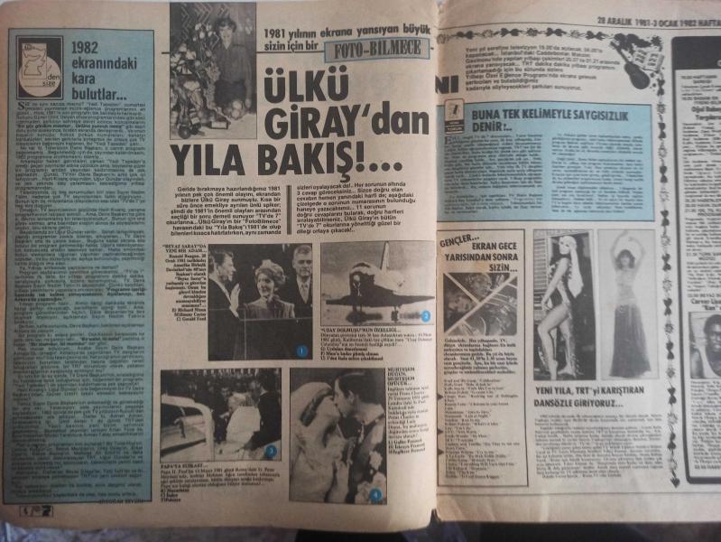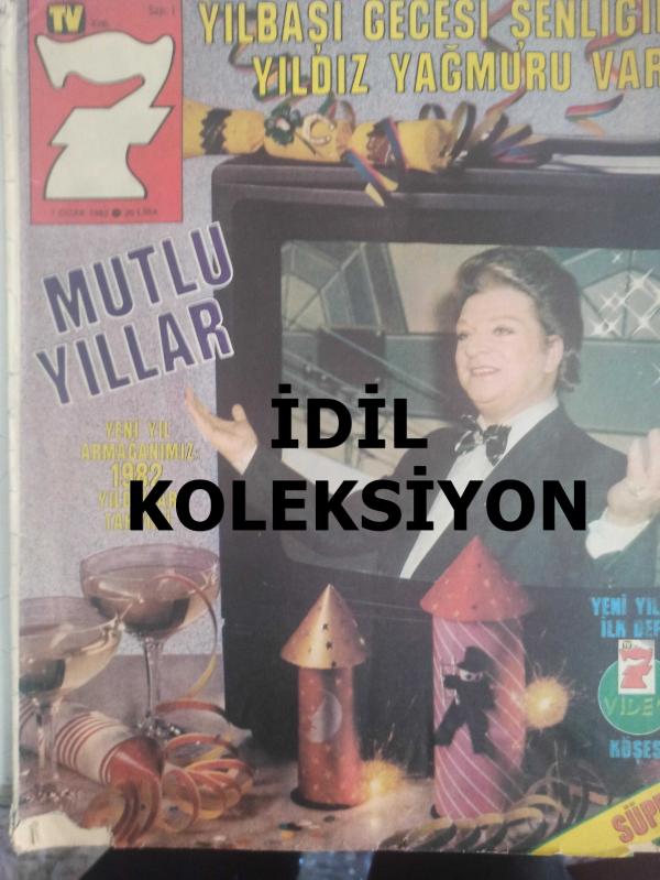 TV'de 7 Gün Haftalık Aktüalite Sinema Tiyatro Müzik ve Magazin Dergisi - 1 Ocak 1982 - Sayı:1 - Zeki Müren - Yılbaşı gecesi şenliğinde yıldız yağmuru var - En büyük şarkıcı, en sevilen şarkıyla ekranda - TRT Genel Müdürü'ne 100 soru - 1982 ekranındaki kara bulutlar - Ülkü Giray'dan yıla bakış! - Yeni Yıla, TRT'yi karıştıran dansözle giriyoruz - Tele program - TV Bulmaca - Ve mikrofonda yılbaşı - Gözünüz ekranda, kulağınız radyoda olsun! - Türkan Şoray - Arçelik Buzdolabı Reklamı fotoğraf ve haberi - Dergi Tam Değildir sadece 8 Sayfası Mevcuttur Yıpranma, sararmalar, kupon kesiği ve yırtılmalar zamana bağlı olarak görülebilir