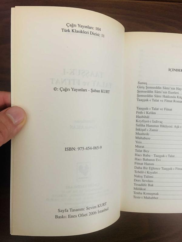 Taaşşuk-ı Talat ve Fitnat, Şemsettin Sami tarafından kaleme alınmıştır. Kitap 2006 yılında Çağrı Yayınları tarafından yayınlanmıştır. 137 sayfadır. Taaşşuk-ı Talat ve Fitnat adlı eser Türkçe dilindedir.