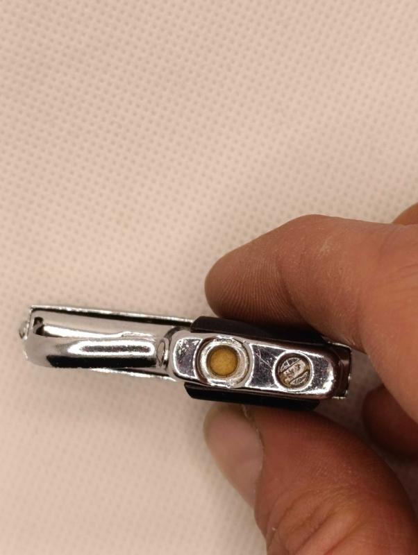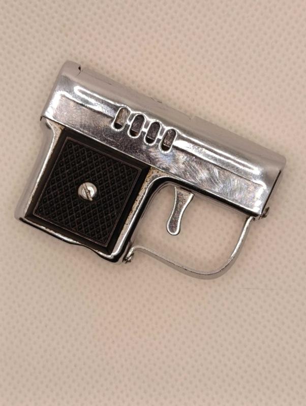 Tabanca şeklinde benzinli çakmak. Çakmaktaşı ve benzin konulduğu takdirde çalışıyor. Alt kısımdan bir vidası eksik.