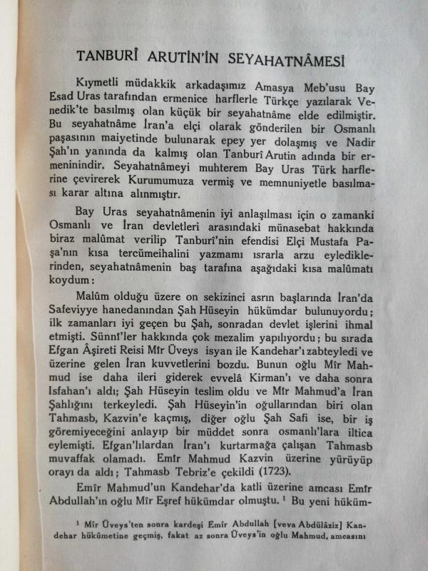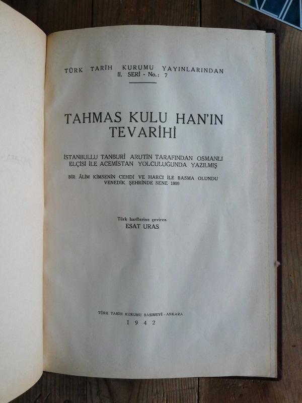 Şahıs bez cildinde. 2. hamur kağıda baskı. Kusursuz temizlikte. Çok nadir bir eser!.. Kitap, Türkiye Cumhuriyeti'nin 7. Diyanet İşleri Başkanı Mehmet Tevfik Gerçeker'in husûsi kitaplığından gelmedir. Tahmas Kulu Han'ın Tevarihi İstanbullu Tanburî Arutin Tarafından Osmanlı Elçisi ile Acemistan Yolculuğunda (Ermeni harfleriyle Türkçe) Yazılmış Bir Âlim Kimsenin Cehdi ve Harcı ile Basma Olundu Venedik Şehrinde Sene 1800 Türk harflerine çeviren Esat Uras Amasya Meb'usu Sunuş Yazısı: Tanburî Arutin'in Seyahatnamesi Prof. İsmail Hakkı Uzunçarşılı Balıkesir Meb'usu