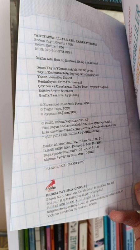 Tahterevalliler Nasıl Hareket Eder? / Küçük Mühendisler İçin Rehber, Jennifer Shand tarafından kaleme alınmıştır. Kitap 2021 yılında ERDEM ÇOCUK YAYINLARI tarafından [İstanbul] 9786052791905 ISBN kodu ile yayınlanmıştır. Bu baskının çevirisi Tuğçe Toğo tarafından yapılmıştır. 48 sayfadır. Tahterevalliler Nasıl Hareket Eder? / Küçük Mühendisler İçin Rehber adlı eser Türkçe dilindedir.