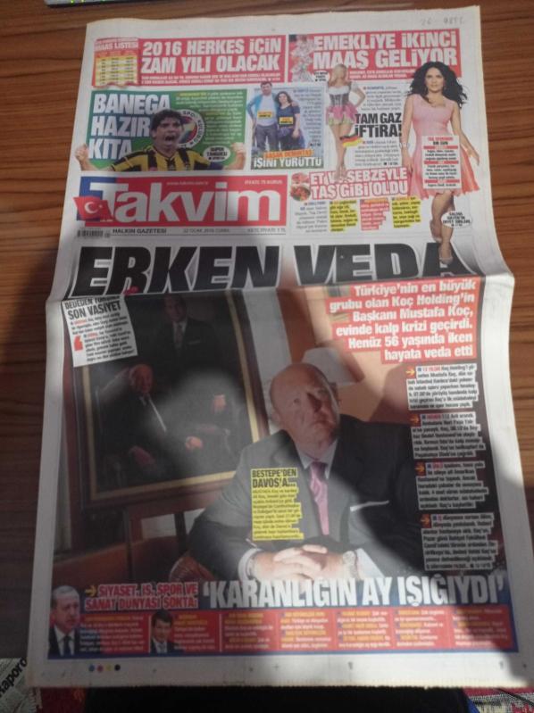 Takvim Gazetesi - 22 Ocak 2016 - Yosun Reza-Derin Mermerci-Tuzlaspor Efsane Hat 500t İle Fenerbahçe Maçına Gitti - Selahattin Demirtaş - Başak Demirtaş - Koç Holding Başkanı Mustafa Koç'a Erken Veda - Taziye Mesajları Mustafa Koç İçin - Vehbi Koç Vasiyeti - Recep Tayyip Erdoğan - Ahmet Davutoğlu - Kemal Kılıçdaroğlu - Güler Sabancı - Ali Koç - Rahmi Koç