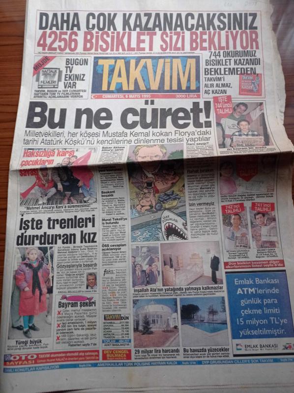 Takvim Gazetesi - 6 Mayıs 1995 - Müslüm Gürses Korsanların Peşinde - Metin Şen Yeşim Salkım Aşkı Bitti - Fenerbahçe Basketbolda Final Yolunda - Sergen Yalçın Çıldırdı - Milletvekilleri Atatürk Köşkü'nü Kendilerine Dinlenme Tesisi Yaptılar - Cumhurbaşkanı Süleyman Demirel - Vali Hayri Kozakçıoğlu - Hüsamettin Cindoruk - Dansöz Tanyeli - Yunan PKK İşbirliği Gün Gibi Ortada adlı eser Türkçe dilindedir.