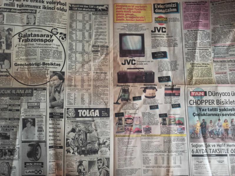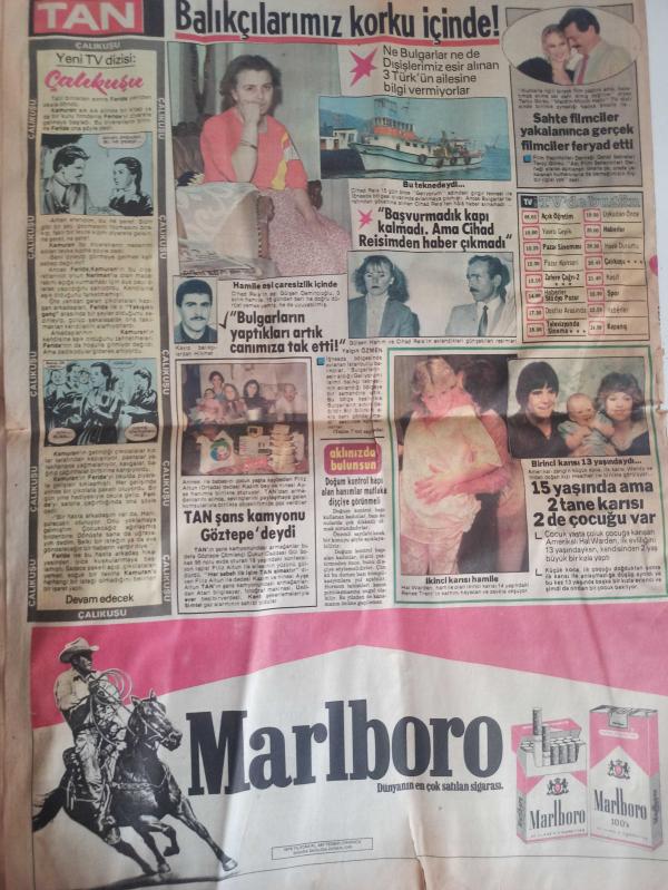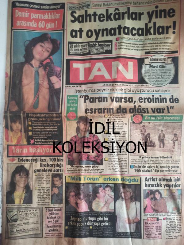 Tan Gazetesi - 20 Nisan 1986 - Nurcan Budak - Hüseyin Parlak - Salih Taşçı - Semra Özal - Turgut Özal - Zeynep Ekren - Nurhan Damcıoğlu - Orhan Eriş - Müjdat Gezen - Kandemir Konduk - Nejat Uygur - Süleyman Turan - Tülin Dilek - Cahit Arat - Hüsamettin Cindoruk - Metin Toytekin - Şehmuz Dalgıç - Rahşan Ecevit - Aydın Güven Gürkan - Margot Kidder - Clint Eastwood - Serap Sevim Özdemir - Melek Ayberk - İbrahim Tatlıses - Zekeriya Alp - Ahmet Suat Özyazıcı - Mustafa Denizli - Tolga Çizgi Romanı - Tanju Gürsu - Cihad Reis - Filiz Altun - Hal Warden - Renee Trent - Marlboro Sigara Reklamı fotoğraf ve haberi - Tam Takım Gazete Yıpranma, sararmalar, kupon kesiği ve yırtılmalar zamana bağlı olarak görülebilir