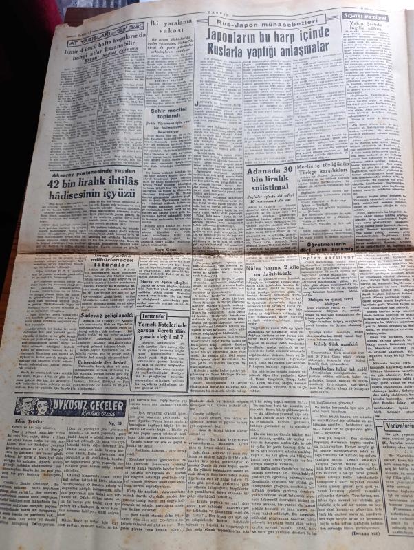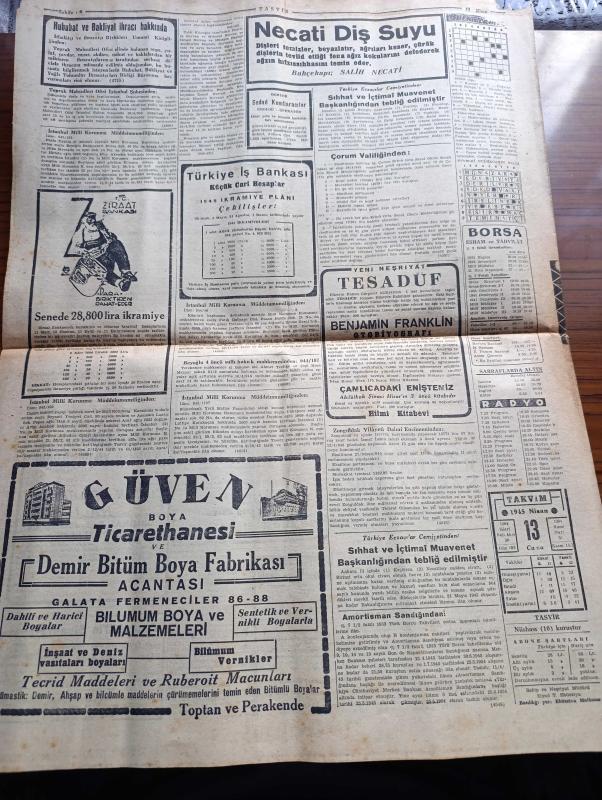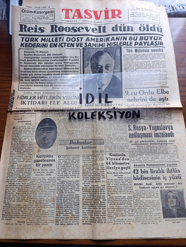 Tasvir Gazetesi - Turkish Newspaper - 13 Nisan 1945 - Reis Roosevelt dün öldü fotoğraf - Türk milleti dost Amerika'nın bu büyük kederini en içten ve samimi hislerle paylaşır - New York 13 radyo Başkan Roosevelt ölüm ilanı - 9. Ordu Elbe nehrini de aştı - Sovyet Rusya Yugoslavya antlaşması imzalandı - şaheser katliamı yazan Peyami Safa - Kızılordu Viyana'dan 64 kilometre ileriye geçti - Kızılyıldız gazetesinin bir yazısı - Himler Hitler'in yerine iktidarı ele aldı - Aksaray postanesinde yapılan 42 bin liralık yolsuzluk hadisesinin içyüzü - uykusuz geceler yazan Kerime Nadir Yazı Dizisi - Şehir tiyatrosu için bir talimatname hazırlanıyor - Güven boya ticarethanesi - radyo programı - borsa - bulmaca - Necati Diş Suyu - Türkiye İş Bankası - Benjamin Franklin otobiyografi Hilmi Kitabevinde - Ziraat Bankası - Ruslar Münih istikametinde ilerliyorlar - klasik Türk musikisi konseri - Amerika'dan bakır tel geldi - nüfus başına 2 kilo un dağıtılacak - meclis iç tüzüğünün Türkçe karşılıkları adlı eser, Kitap > Süreli Yayınlar > Gazeteler > Türkiye > Genel > Günlük kategorisinde İkinci El olarak satıştadır.