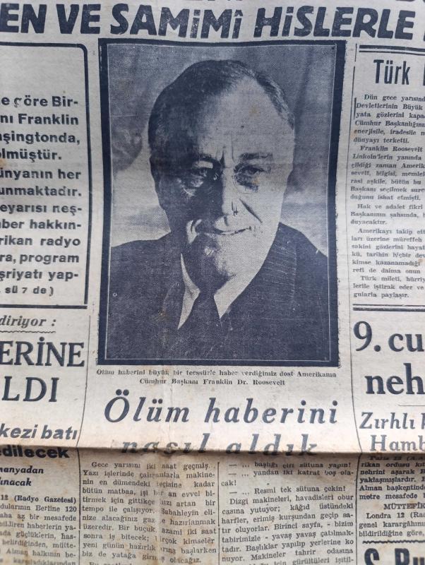 Tasvir Gazetesi - Turkish Newspaper - 13 Nisan 1945 - Reis Roosevelt dün öldü fotoğraf - Türk milleti dost Amerika'nın bu büyük kederini en içten ve samimi hislerle paylaşır - New York 13 radyo Başkan Roosevelt ölüm ilanı - 9. Ordu Elbe nehrini de aştı - Sovyet Rusya Yugoslavya antlaşması imzalandı - şaheser katliamı yazan Peyami Safa - Kızılordu Viyana'dan 64 kilometre ileriye geçti - Kızılyıldız gazetesinin bir yazısı - Himler Hitler'in yerine iktidarı ele aldı - Aksaray postanesinde yapılan 42 bin liralık yolsuzluk hadisesinin içyüzü - uykusuz geceler yazan Kerime Nadir Yazı Dizisi - Şehir tiyatrosu için bir talimatname hazırlanıyor - Güven boya ticarethanesi - radyo programı - borsa - bulmaca - Necati Diş Suyu - Türkiye İş Bankası - Benjamin Franklin otobiyografi Hilmi Kitabevinde - Ziraat Bankası - Ruslar Münih istikametinde ilerliyorlar - klasik Türk musikisi konseri - Amerika'dan bakır tel geldi - nüfus başına 2 kilo un dağıtılacak - meclis iç tüzüğünün Türkçe karşılıkları, Ziyad Ebüzziya tarafından kaleme alınmıştır. Tasvir Gazetesi - Turkish Newspaper - 13 Nisan 1945 - Reis Roosevelt dün öldü fotoğraf - Türk milleti dost Amerika'nın bu büyük kederini en içten ve samimi hislerle paylaşır - New York 13 radyo Başkan Roosevelt ölüm ilanı - 9. Ordu Elbe nehrini de aştı - Sovyet Rusya Yugoslavya antlaşması imzalandı - şaheser katliamı yazan Peyami Safa - Kızılordu Viyana'dan 64 kilometre ileriye geçti - Kızılyıldız gazetesinin bir yazısı - Himler Hitler'in yerine iktidarı ele aldı - Aksaray postanesinde yapılan 42 bin liralık yolsuzluk hadisesinin içyüzü - uykusuz geceler yazan Kerime Nadir Yazı Dizisi - Şehir tiyatrosu için bir talimatname hazırlanıyor - Güven boya ticarethanesi - radyo programı - borsa - bulmaca - Necati Diş Suyu - Türkiye İş Bankası - Benjamin Franklin otobiyografi Hilmi Kitabevinde - Ziraat Bankası - Ruslar Münih istikametinde ilerliyorlar - klasik Türk musikisi konseri - Amerika'dan bakır tel geldi - nüfus başına 2 kilo un dağıtılacak - meclis iç tüzüğünün Türkçe karşılıkları adlı eser Türkçe dilindedir.