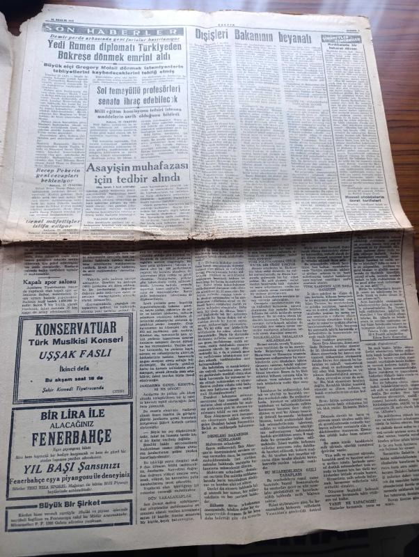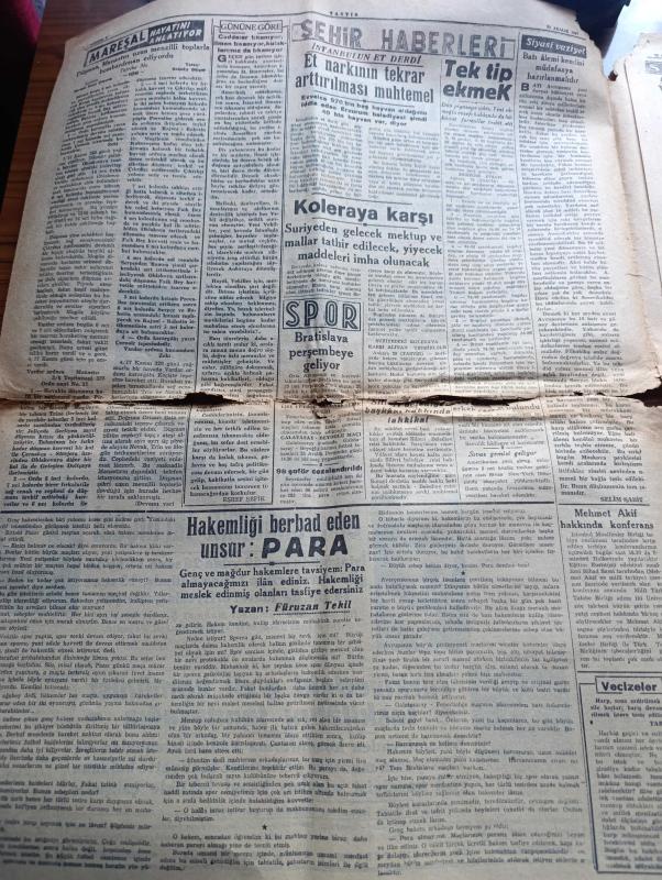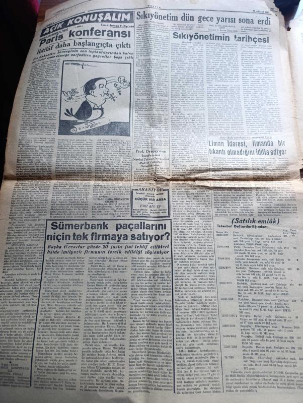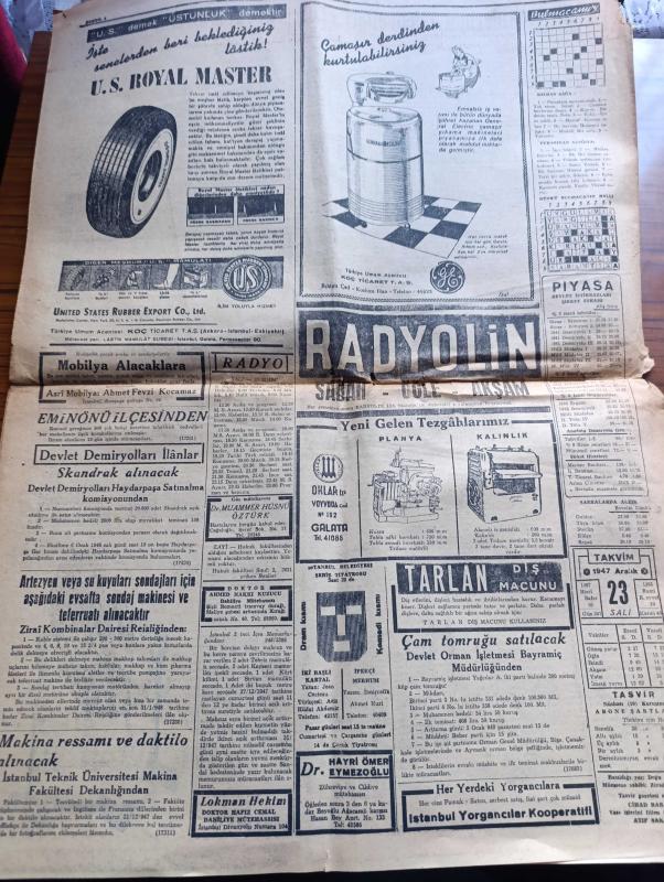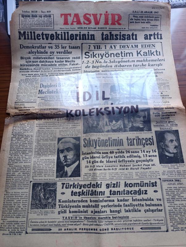 Tasvir Gazetesi - Turkish Newspaper - 23 Aralık 1947 - işçinin durumu ile yakından ilgilenmeyiz yazan Cihad Baban Başmakale - milletvekillerinin tahsisatı arttı - demokratlar ve 35'ler tasarı aleyhinde oy verdiler - 7 yıl 1 ay devam eden sıkıyönetim kalktı 1 2 3 no lu sıkıyönetim mahkemeleri bugünden itibaren tarihe karıştı - sıkıyönetimin tarihçesi - İstanbul'da son 40 yılda 26 sene 14 ay 16 gün idare-i örfiye tatbik edilmiş - polis kadrosuna 400 jandarma verildi - Türkiye'deki gizli komünist teşkilatını tanıtacağız - Namık Kemal'i anma gününde Hamdullah Suphi Tanrıöver mühim bir konuşma yaptı - hakemliği berbat eden unsur para yazan Füruzan Tekil - koleraya karşı Suriye'den gelecek mektup ve mallar tathir edilecek yiyecek maddeleri imha olunacak - sol temayüllü profesörleri senato ihraç edebilecek - Recep Peker'in yeni cevapları bekleniyor - Paris konferansı - Sümerbank paçallarını ne için tek firmaya satıyor - Radyolin diş macunu -İstanbul belediyesi şehir tiyatrosu iki başlı kartal adlı eser, Kitap > Süreli Yayınlar > Gazeteler kategorisinde İkinci El olarak satıştadır.