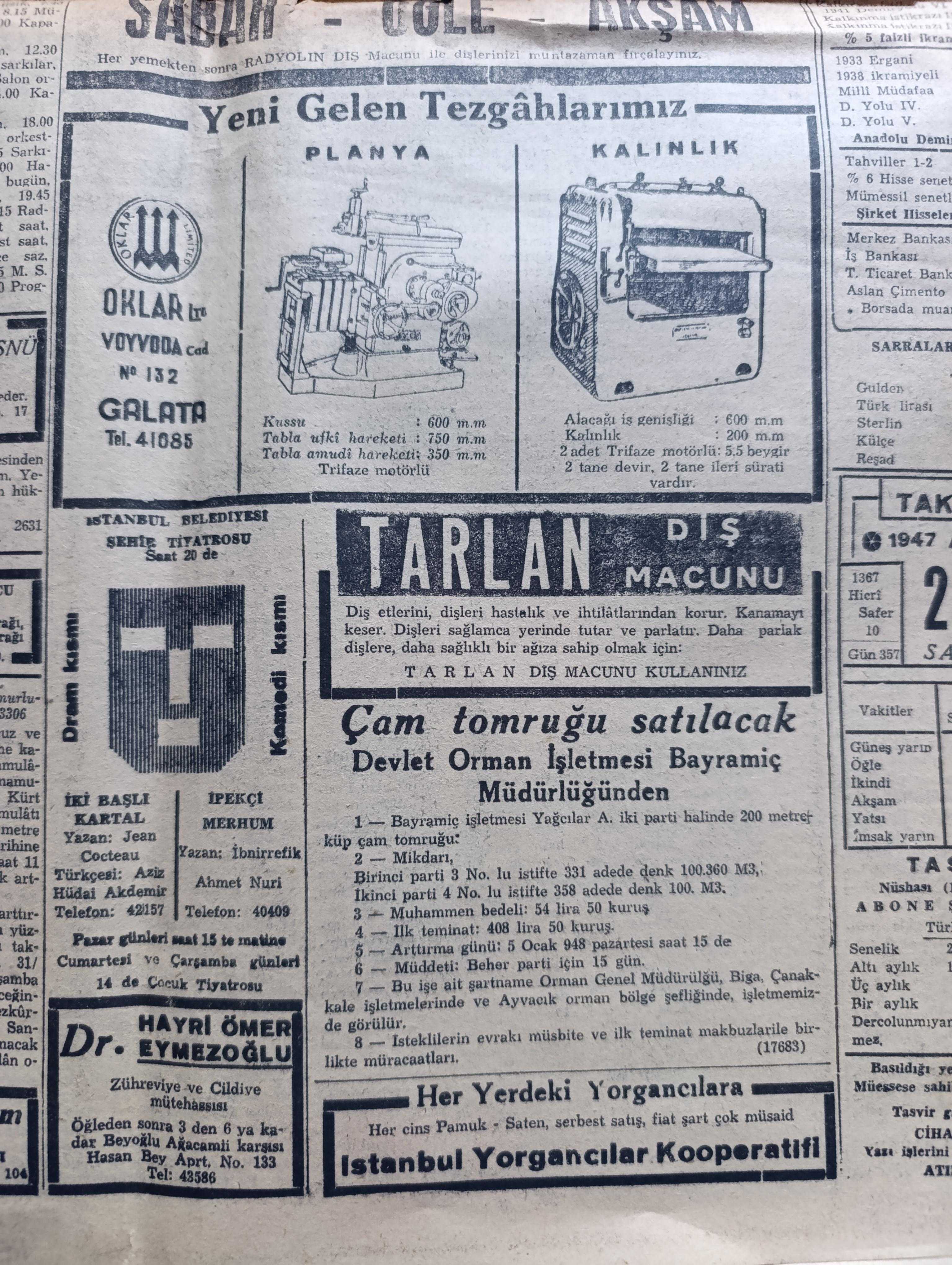 Tasvir Gazetesi - Turkish Newspaper - 23 Aralık 1947 - işçinin durumu ile yakından ilgilenmeyiz yazan Cihad Baban Başmakale - milletvekillerinin tahsisatı arttı - demokratlar ve 35'ler tasarı aleyhinde oy verdiler - 7 yıl 1 ay devam eden sıkıyönetim kalktı 1 2 3 no lu sıkıyönetim mahkemeleri bugünden itibaren tarihe karıştı - sıkıyönetimin tarihçesi - İstanbul'da son 40 yılda 26 sene 14 ay 16 gün idare-i örfiye tatbik edilmiş - polis kadrosuna 400 jandarma verildi - Türkiye'deki gizli komünist teşkilatını tanıtacağız - Namık Kemal'i anma gününde Hamdullah Suphi Tanrıöver mühim bir konuşma yaptı - hakemliği berbat eden unsur para yazan Füruzan Tekil - koleraya karşı Suriye'den gelecek mektup ve mallar tathir edilecek yiyecek maddeleri imha olunacak - sol temayüllü profesörleri senato ihraç edebilecek - Recep Peker'in yeni cevapları bekleniyor - Paris konferansı - Sümerbank paçallarını ne için tek firmaya satıyor - Radyolin diş macunu -İstanbul belediyesi şehir tiyatrosu iki başlı kartal, Ziyad Ebüzziya tarafından kaleme alınmıştır. Tasvir Gazetesi - Turkish Newspaper - 23 Aralık 1947 - işçinin durumu ile yakından ilgilenmeyiz yazan Cihad Baban Başmakale - milletvekillerinin tahsisatı arttı - demokratlar ve 35'ler tasarı aleyhinde oy verdiler - 7 yıl 1 ay devam eden sıkıyönetim kalktı 1 2 3 no lu sıkıyönetim mahkemeleri bugünden itibaren tarihe karıştı - sıkıyönetimin tarihçesi - İstanbul'da son 40 yılda 26 sene 14 ay 16 gün idare-i örfiye tatbik edilmiş - polis kadrosuna 400 jandarma verildi - Türkiye'deki gizli komünist teşkilatını tanıtacağız - Namık Kemal'i anma gününde Hamdullah Suphi Tanrıöver mühim bir konuşma yaptı - hakemliği berbat eden unsur para yazan Füruzan Tekil - koleraya karşı Suriye'den gelecek mektup ve mallar tathir edilecek yiyecek maddeleri imha olunacak - sol temayüllü profesörleri senato ihraç edebilecek - Recep Peker'in yeni cevapları bekleniyor - Paris konferansı - Sümerbank paçallarını ne için tek firmaya satıyor - Radyolin diş macunu -İstanbul belediyesi şehir tiyatrosu iki başlı kartal adlı eser Türkçe dilindedir.
